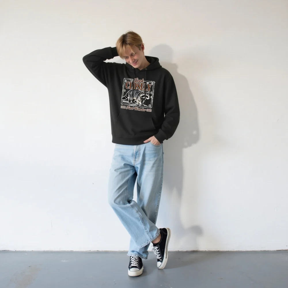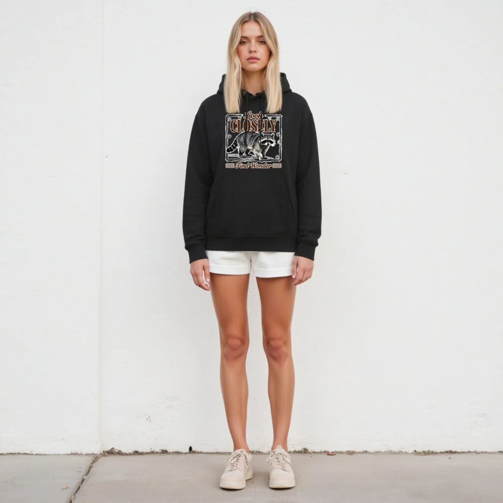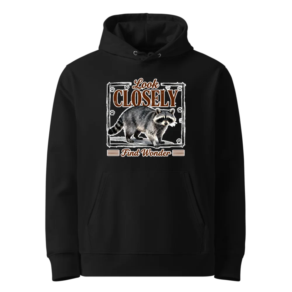 Raccoon Hoodie ‘Look Closely Find Wonder’ – Unisex Eco-Friendly Hooded Sweatshirt