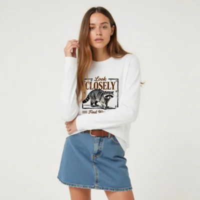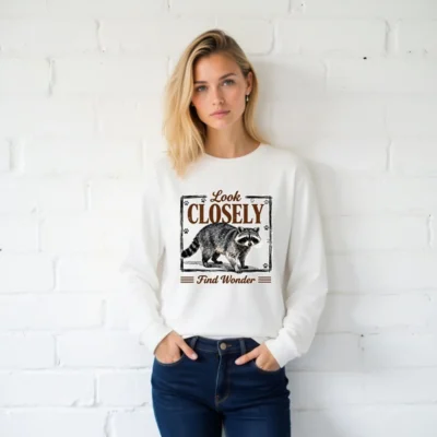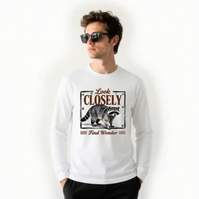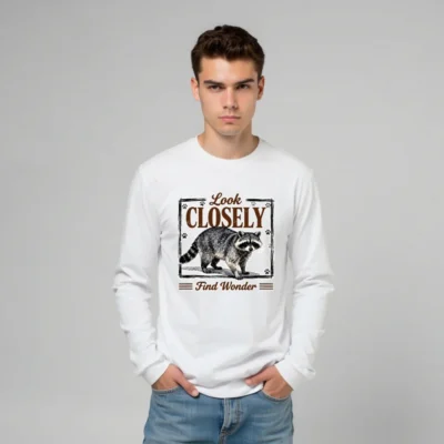 This unisex long sleeve tee features a charming raccoon illustration with the inspiring phrase ‘Look Closely, Find Wonder’—perfect for nature lovers and curious minds. Printed on soft, durable cotton fabric, it offers all-day comfort and a relaxed fit for men and women. Ideal for casual wear, outdoor adventures, or gifting. The vintage-style design combines whimsy and wisdom, making it a standout piece that sparks conversation. Machine washable and eco-friendly printing ensure lasting quality and color vibrancy.