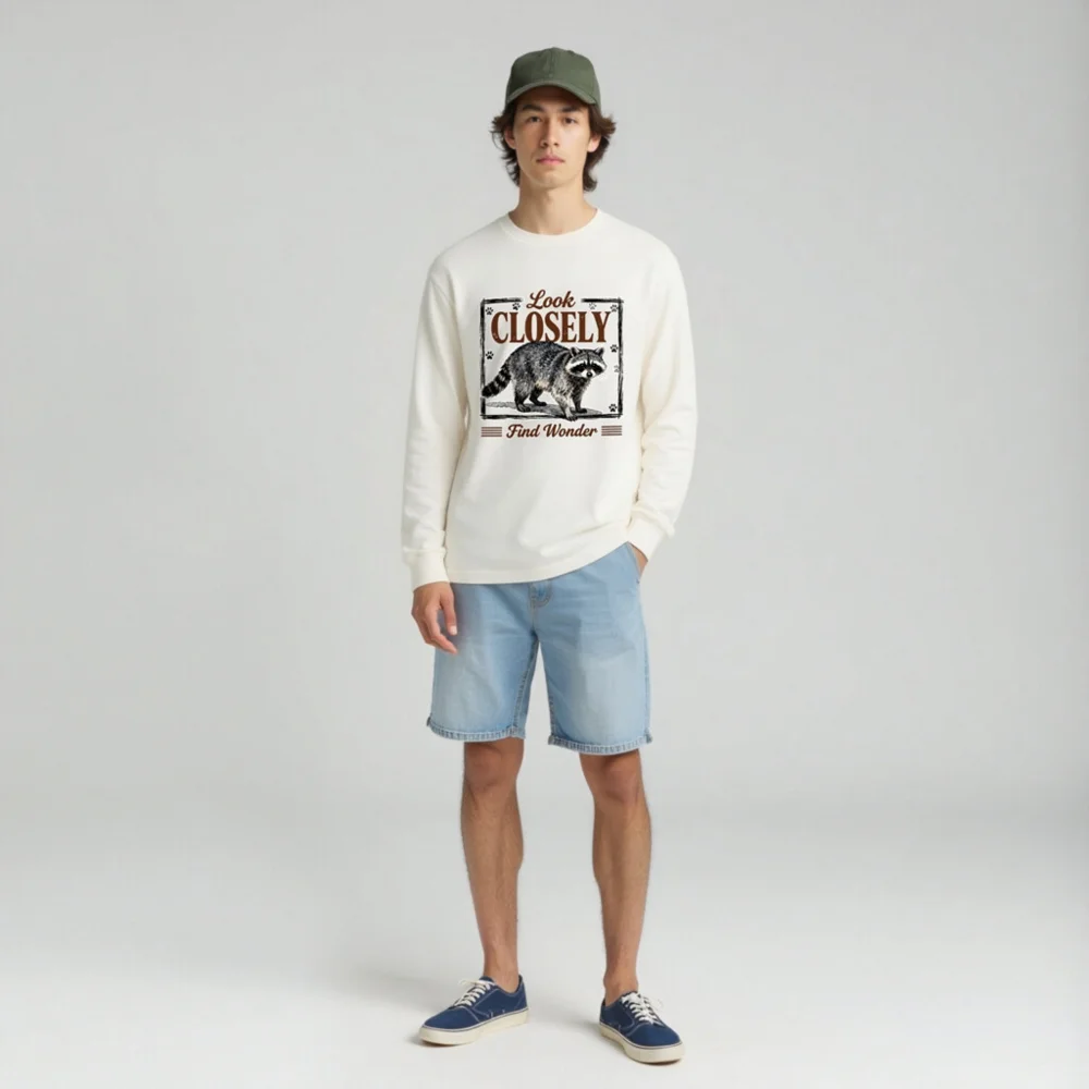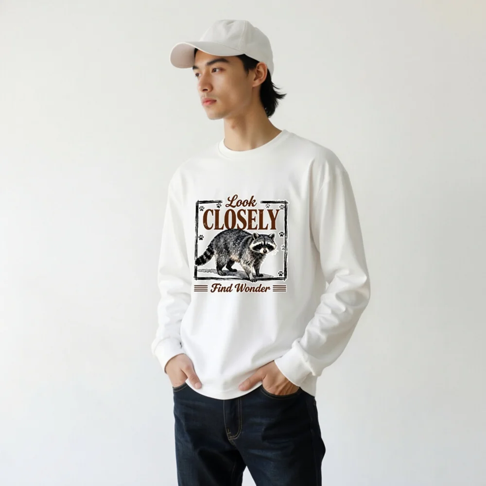 This unisex long sleeve tee features a charming raccoon illustration with the inspiring phrase ‘Look Closely, Find Wonder’—perfect for nature lovers and curious minds. Printed on soft, durable cotton fabric, it offers all-day comfort and a relaxed fit for men and women. Ideal for casual wear, outdoor adventures, or gifting. The vintage-style design combines whimsy and wisdom, making it a standout piece that sparks conversation. Machine washable and eco-friendly printing ensure lasting quality and color vibrancy.