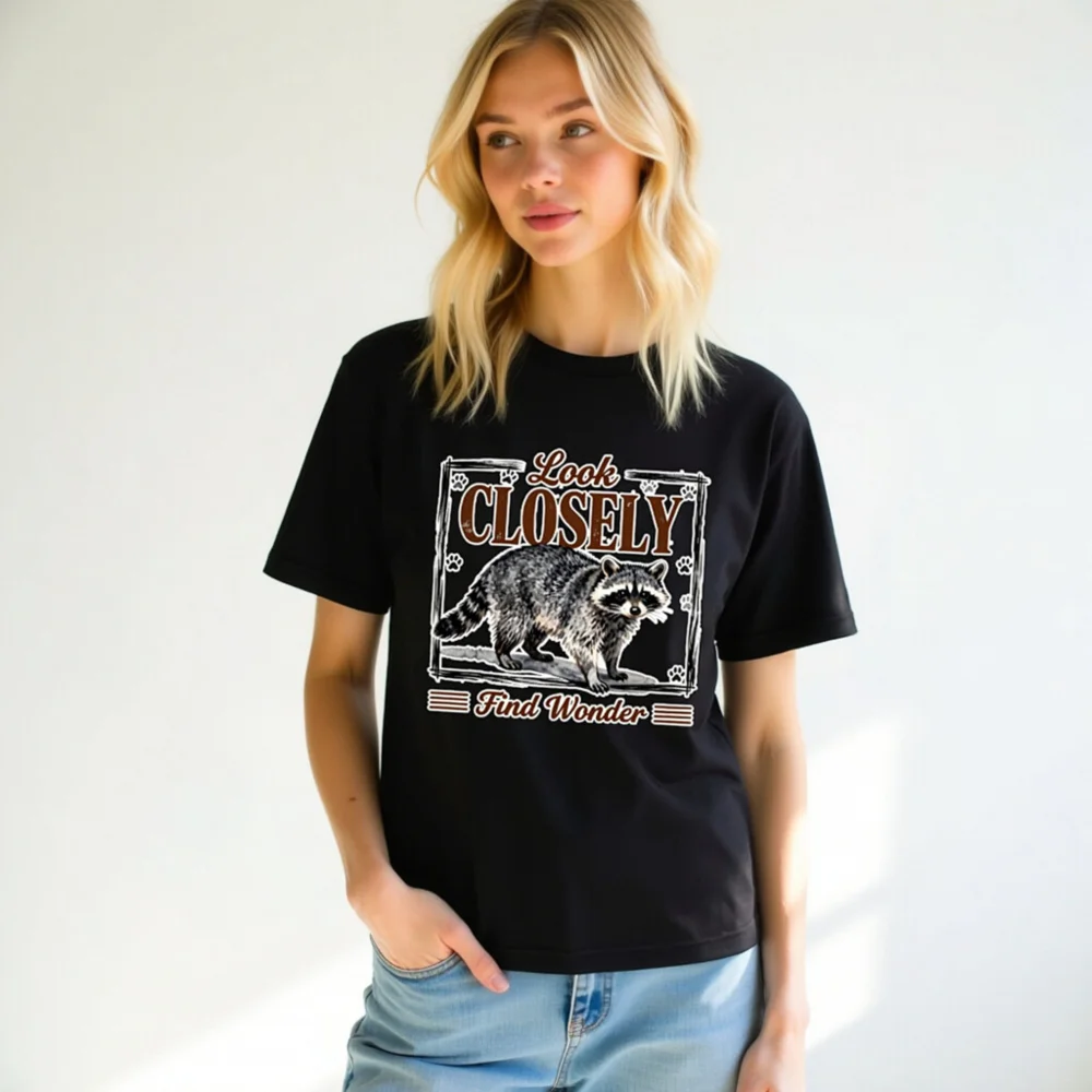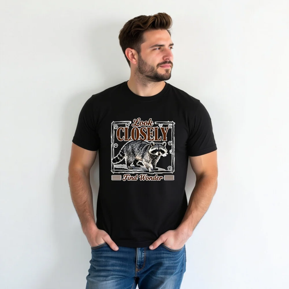 This unisex staple t-shirt features a charming raccoon illustration with the inspiring phrase ‘Look Closely, Find Wonder’—perfect for nature lovers and curious minds. Printed in high-quality, soft cotton for all-day comfort. Ideal for casual wear, outdoor adventures, or gifting. The vintage-style design combines whimsy and wisdom, making it a standout piece for adults who appreciate wildlife and thoughtful messaging. Machine washable and durable, this tee blends style, comfort, and meaning—wear your wonder proudly.