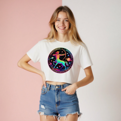 Vibrant rainbow-hued Sagittarius centaur archer design on a white women’s crop top, celebrating adventurous spirit and astrological symbolism. Features cosmic planets, stars, and bold ‘SAGITTARIUS’ + ‘ADVENTUROUS SPIRIT’ text in a circular motif. Stylish, comfortable, and perfect for astrology lovers seeking bold self-expression.
