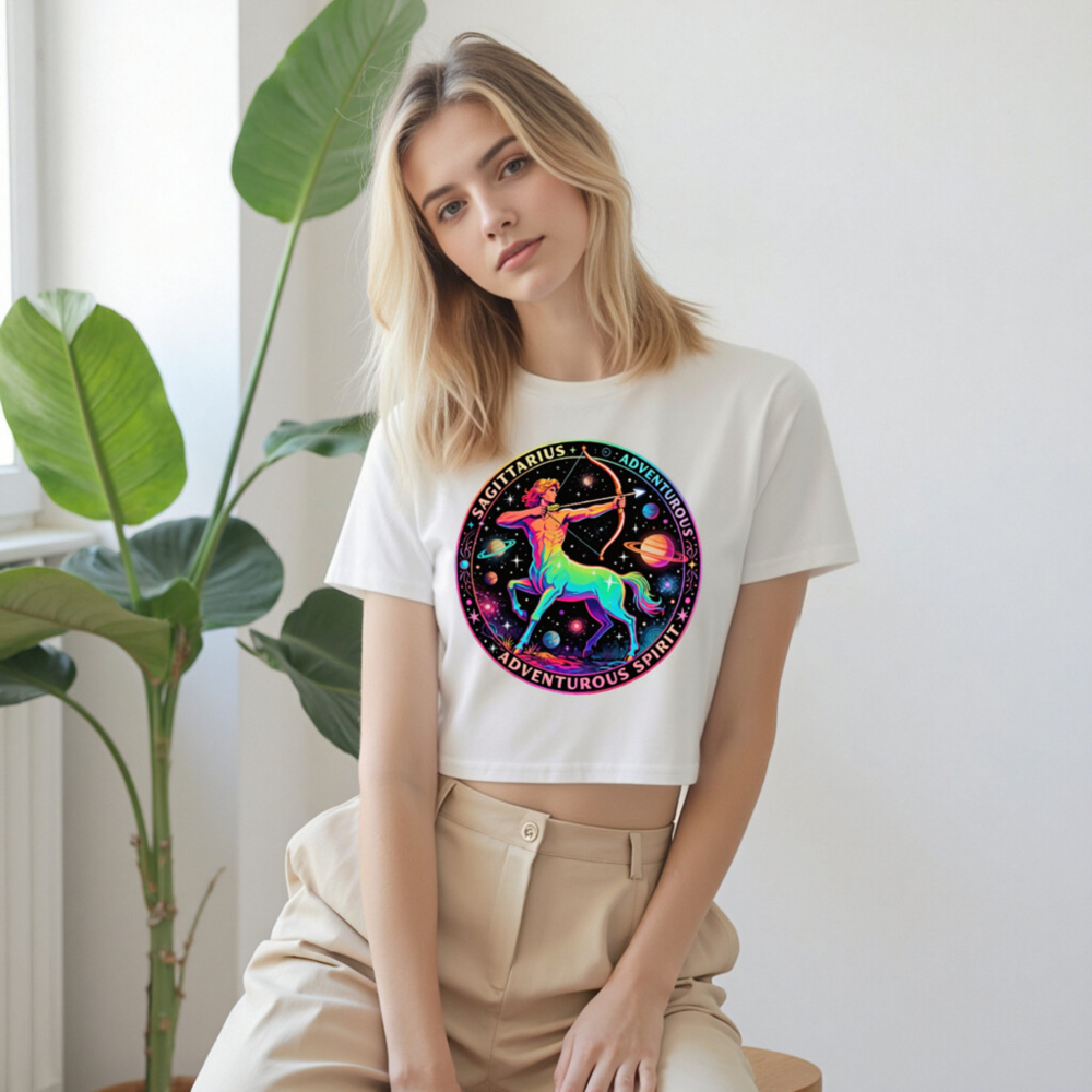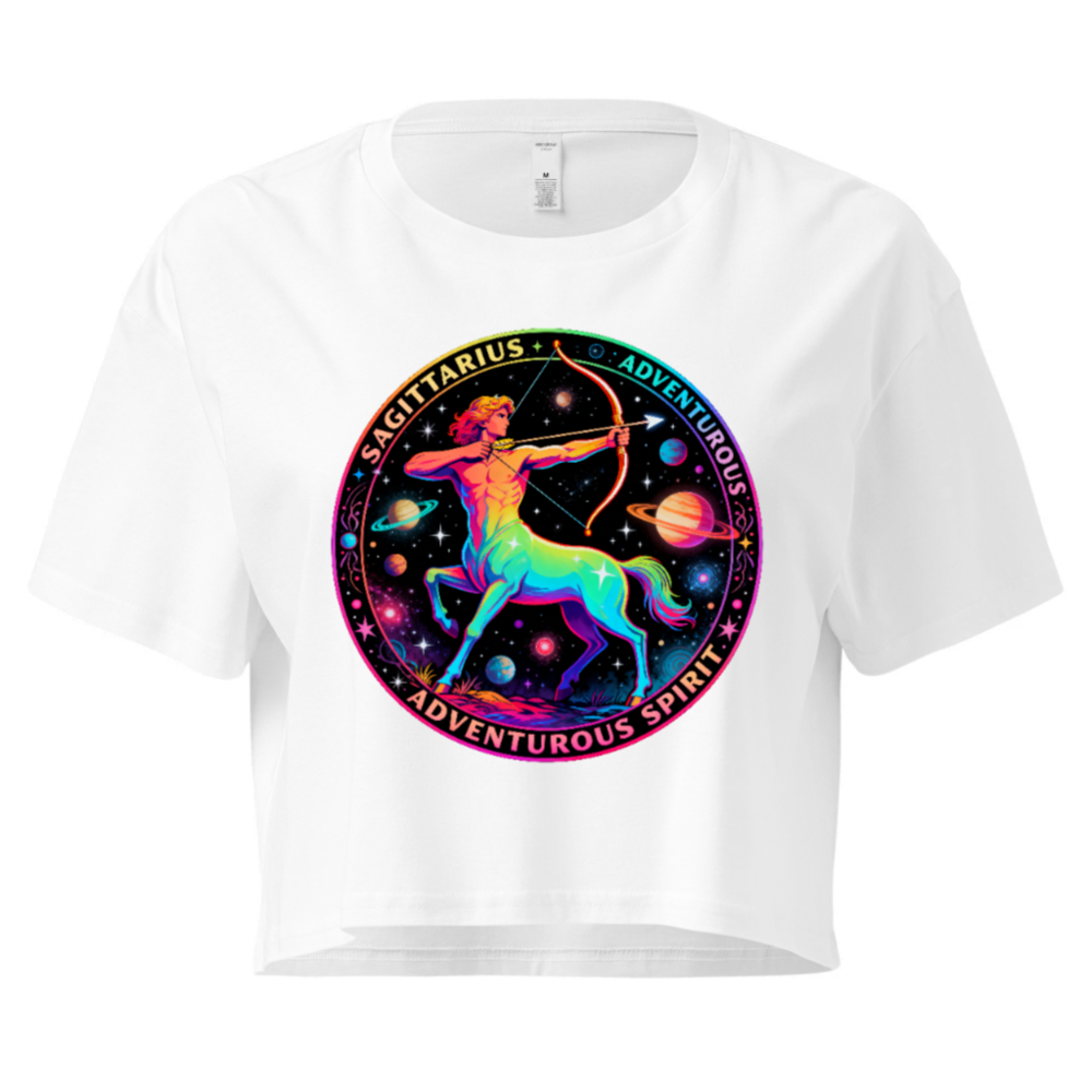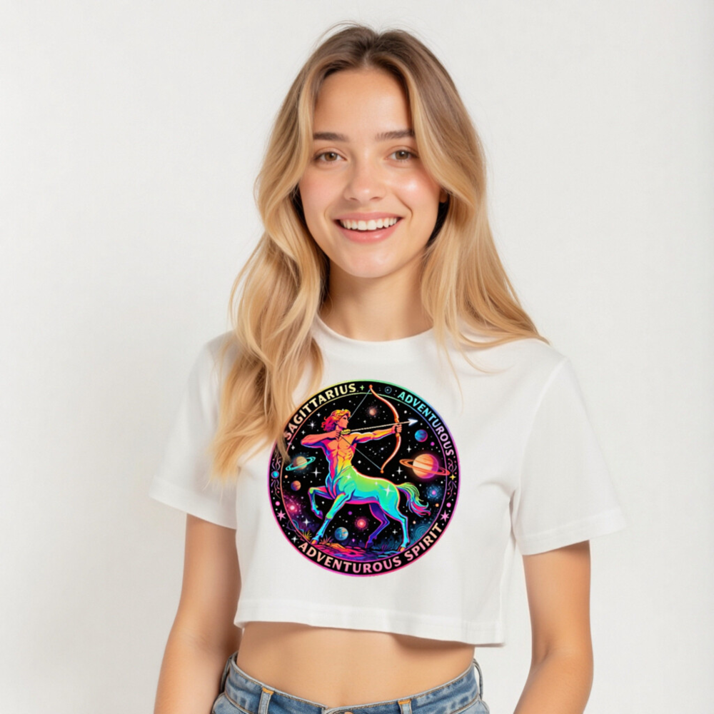 Vibrant rainbow-hued Sagittarius centaur archer design on a white women’s crop top, celebrating adventurous spirit and astrological symbolism. Features cosmic planets, stars, and bold ‘SAGITTARIUS’ + ‘ADVENTUROUS SPIRIT’ text in a circular motif. Stylish, comfortable, and perfect for astrology lovers seeking bold self-expression.