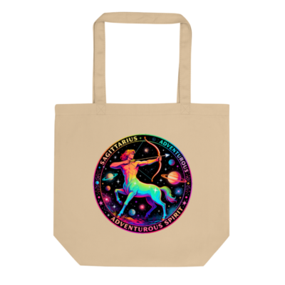 Vibrant rainbow-hued Sagittarius centaur archer design on a sustainable eco oyster tote bag. Made from certified organic cotton canvas, this reusable shopping bag embodies adventurous spirit and cosmic style. Lightweight, durable, and ethically crafted for everyday use—perfect for travelers, students, and astrology lovers seeking planet-friendly fashion.