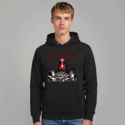 Wear the ‘Rest in Pixels’ design—a haunting digital graveyard motif with glowing red monitor, tangled cables, and vintage tech—on this unisex essential eco hoodie. Crafted for comfort and sustainability, it features a classic black fit, front pouch pocket, and durable construction. Perfect for gamers, retro-tech fans, and eco-conscious fashion lovers seeking bold statement wear.