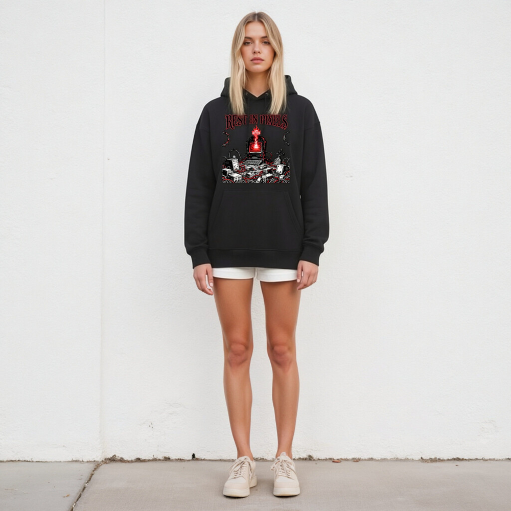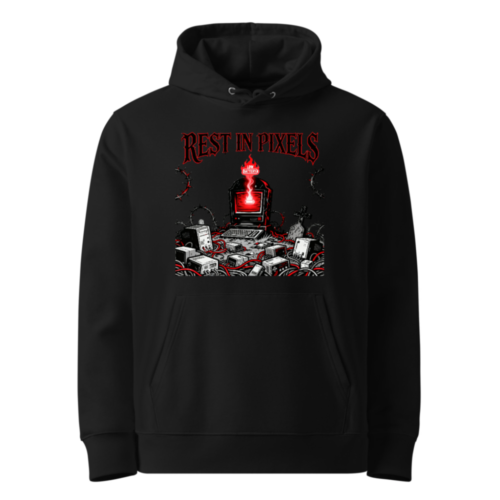 Rest in Pixels Eco Hoodie | Unisex Essential Black Sweatshirt with Digital Graveyard Art