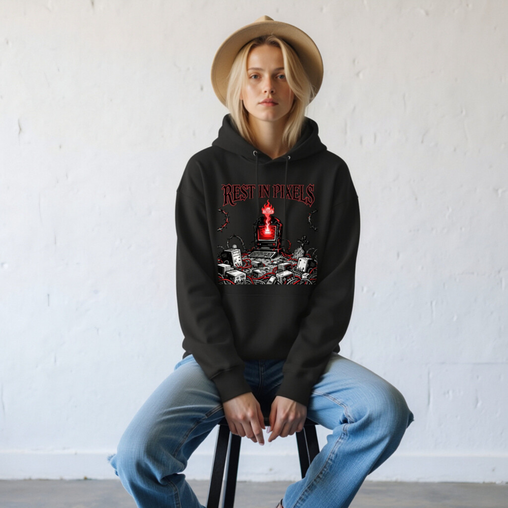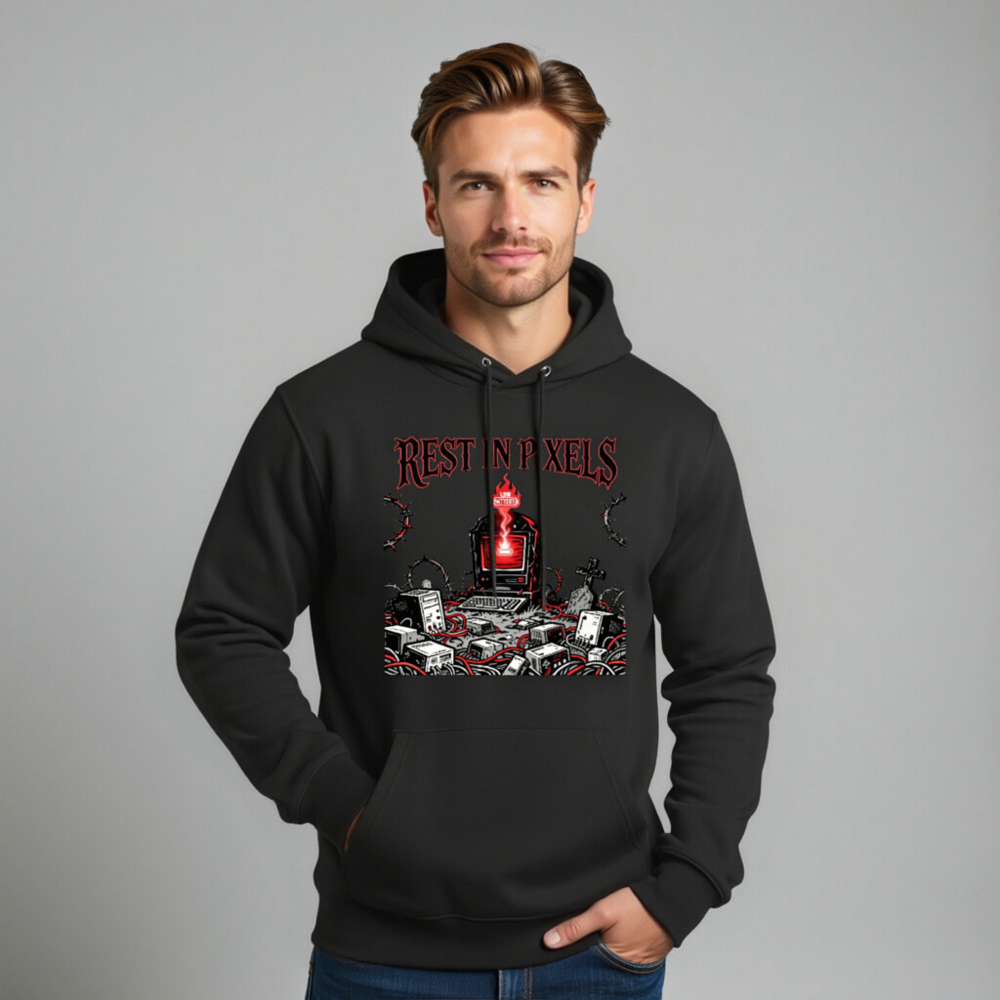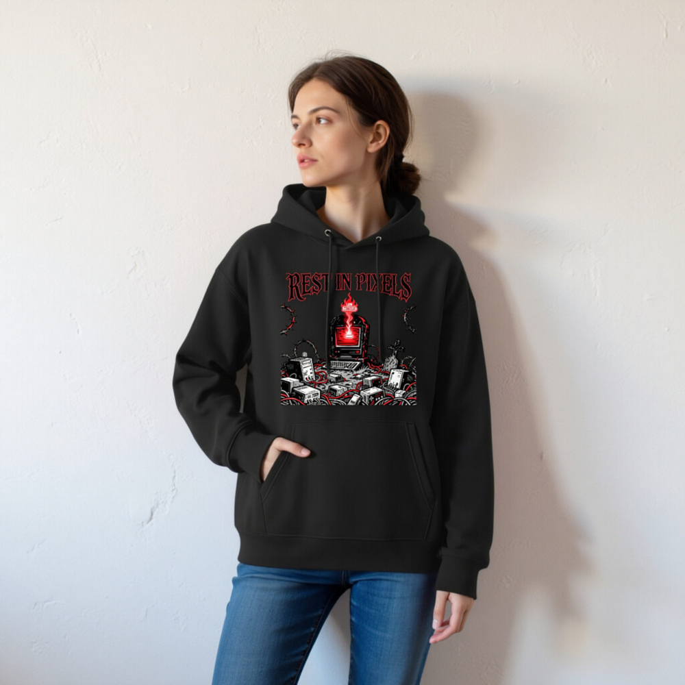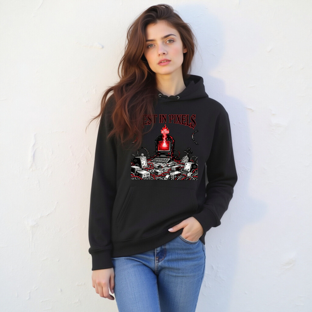 Wear the ‘Rest in Pixels’ design—a haunting digital graveyard motif with glowing red monitor, tangled cables, and vintage tech—on this unisex essential eco hoodie. Crafted for comfort and sustainability, it features a classic black fit, front pouch pocket, and durable construction. Perfect for gamers, retro-tech fans, and eco-conscious fashion lovers seeking bold statement wear.