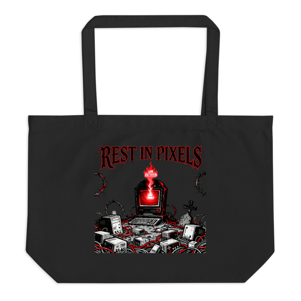 A large black organic cotton tote bag featuring the ‘Rest in Pixels’ graphic: a pixelated tombstone with glowing red screen, barbed wire, and vintage tech relics. Designed for eco-conscious users seeking bold, geek-chic style. Made from sustainable materials—no certifications claimed beyond material origin. Ideal for everyday carry or as a statement accessory.