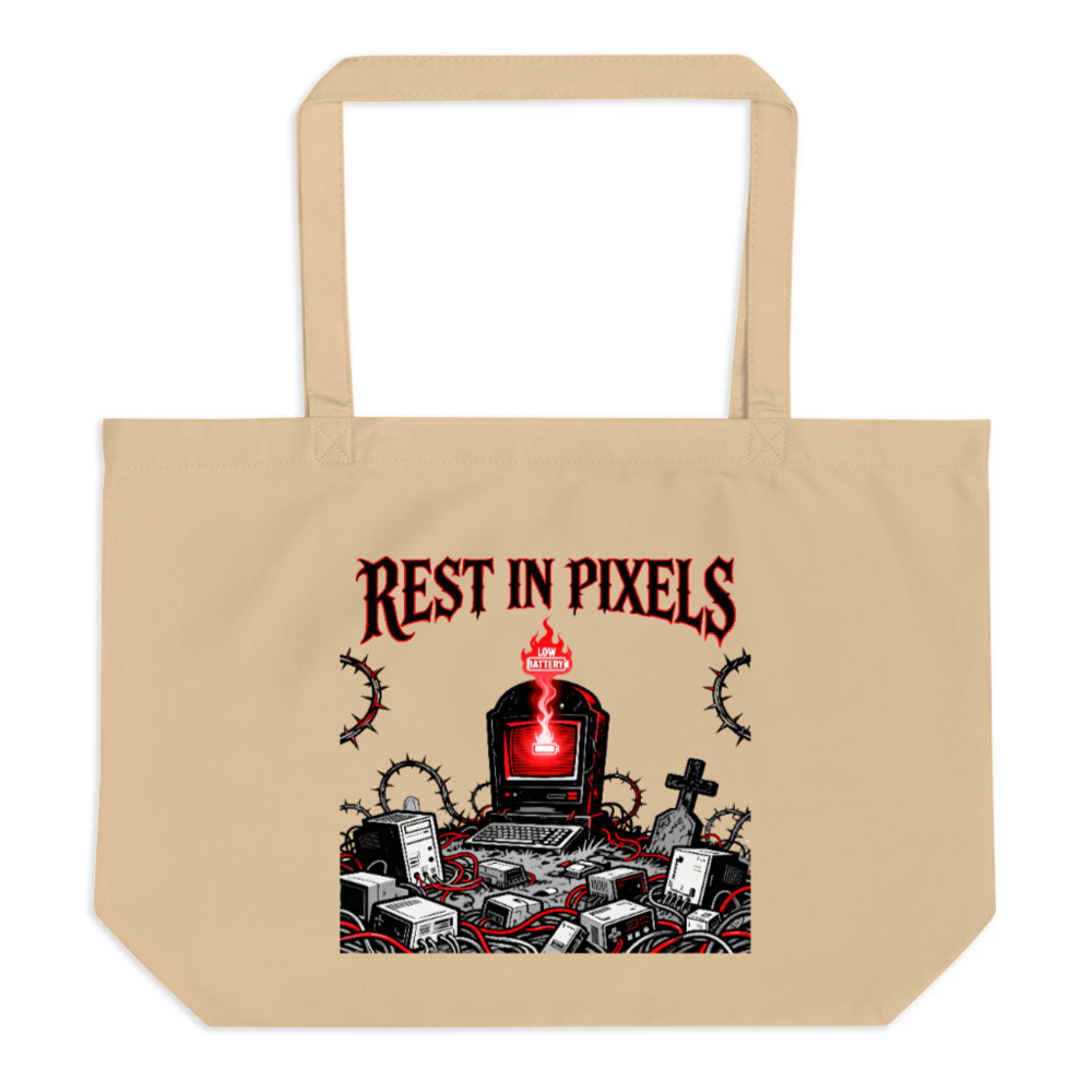 A large, eco-friendly organic tote bag featuring the ‘Rest in Pixels’ design—a graveyard of vintage tech with a glowing low-battery monitor, barbed wire, and retro computers. Made from sustainable materials for everyday use. Ideal for gamers, tech lovers, and eco-conscious shoppers seeking stylish, durable, and planet-friendly accessories.