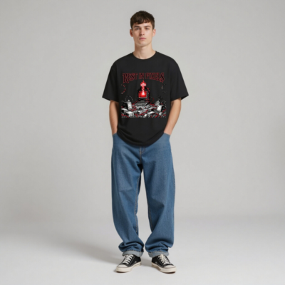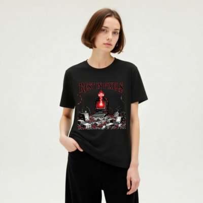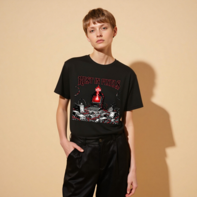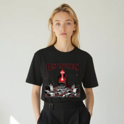 A black unisex staple t-shirt featuring the ‘Rest in Pixels’ gothic tech graveyard design — a haunting scene with a glowing red monitor, scattered electronics, barbed wire, and tombstones. Perfect for gamers, retro tech lovers, and fans of dark cyberpunk aesthetics. High-quality cotton blend, classic fit, designed for everyday wear.