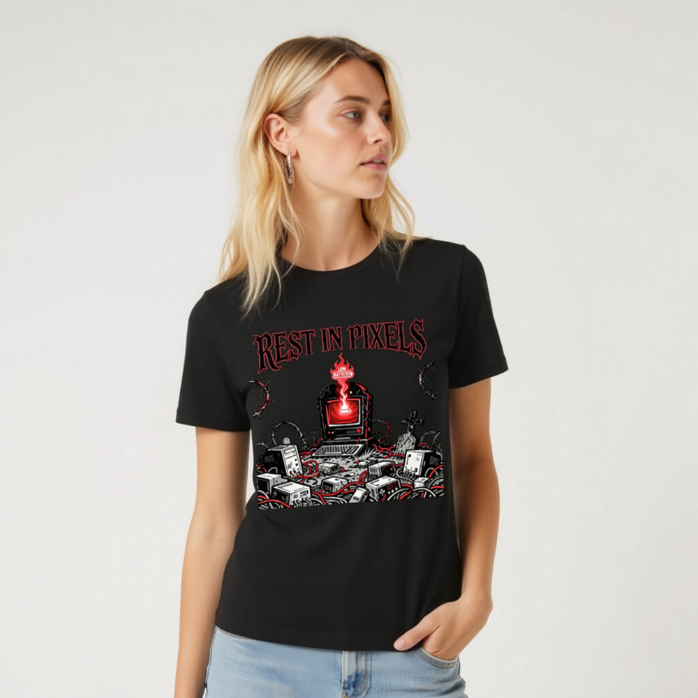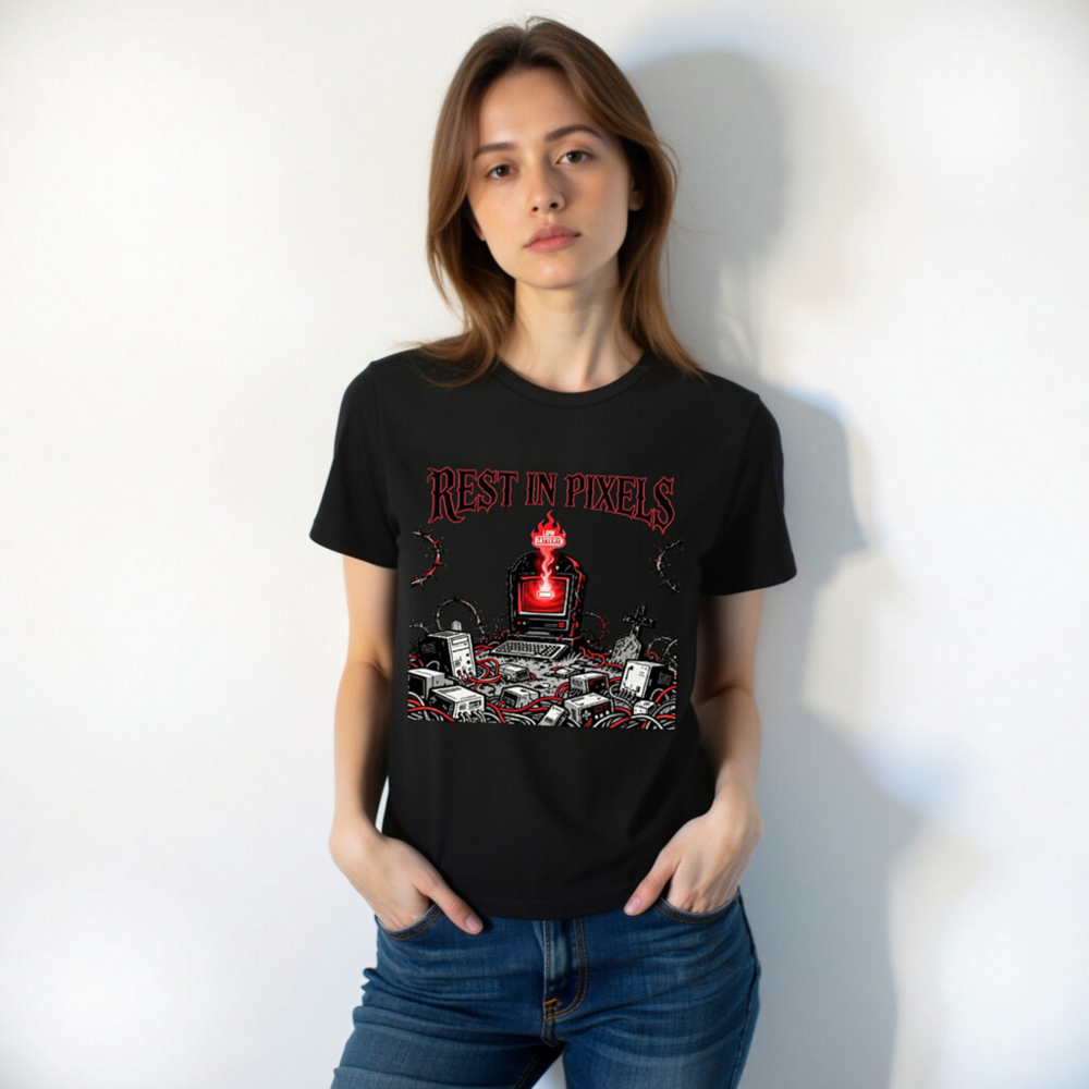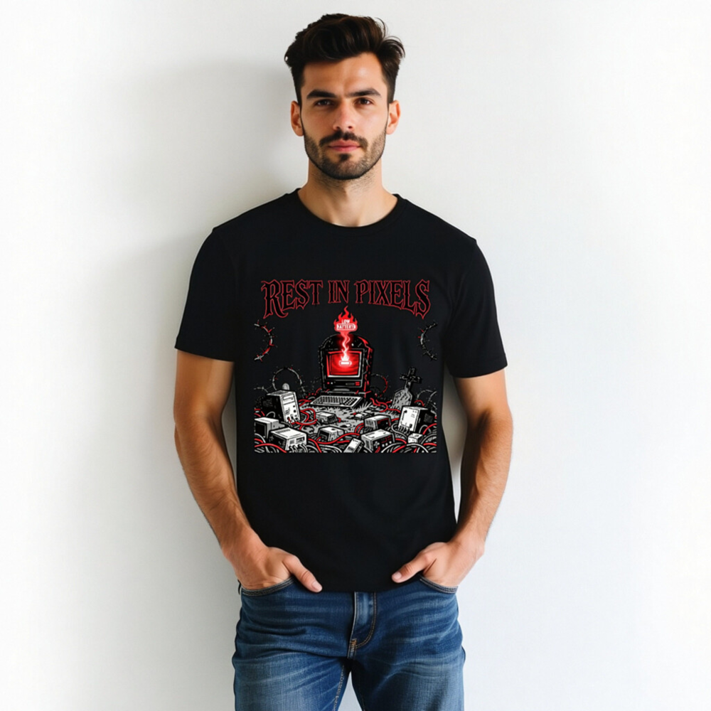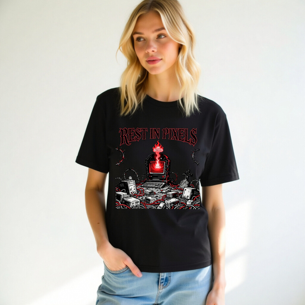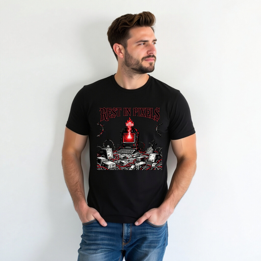 A black unisex staple t-shirt featuring the ‘Rest in Pixels’ gothic tech graveyard design — a haunting scene with a glowing red monitor, scattered electronics, barbed wire, and tombstones. Perfect for gamers, retro tech lovers, and fans of dark cyberpunk aesthetics. High-quality cotton blend, classic fit, designed for everyday wear.