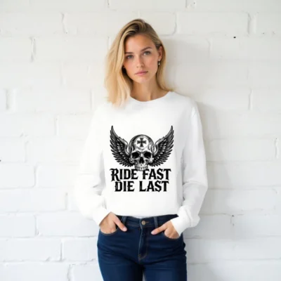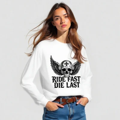 Unisex long sleeve tee featuring a bold winged skull with cross emblem and the iconic ‘Ride Fast Die Last’ slogan. Premium cotton blend, classic fit, perfect for biker culture and edgy streetwear. Designed for comfort and statement-making style—no extra embellishments, just raw attitude. Ideal for fans of motorcycle aesthetics and timeless dark design.