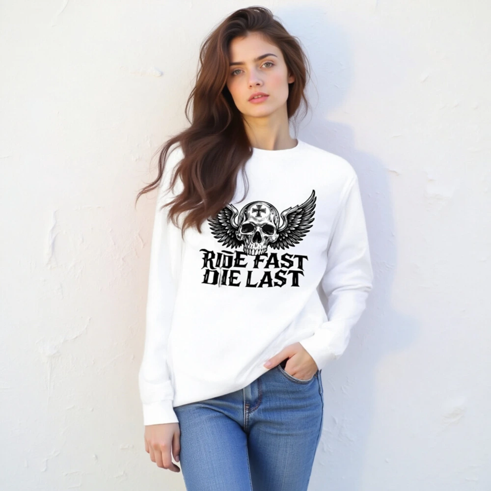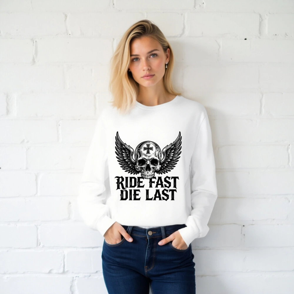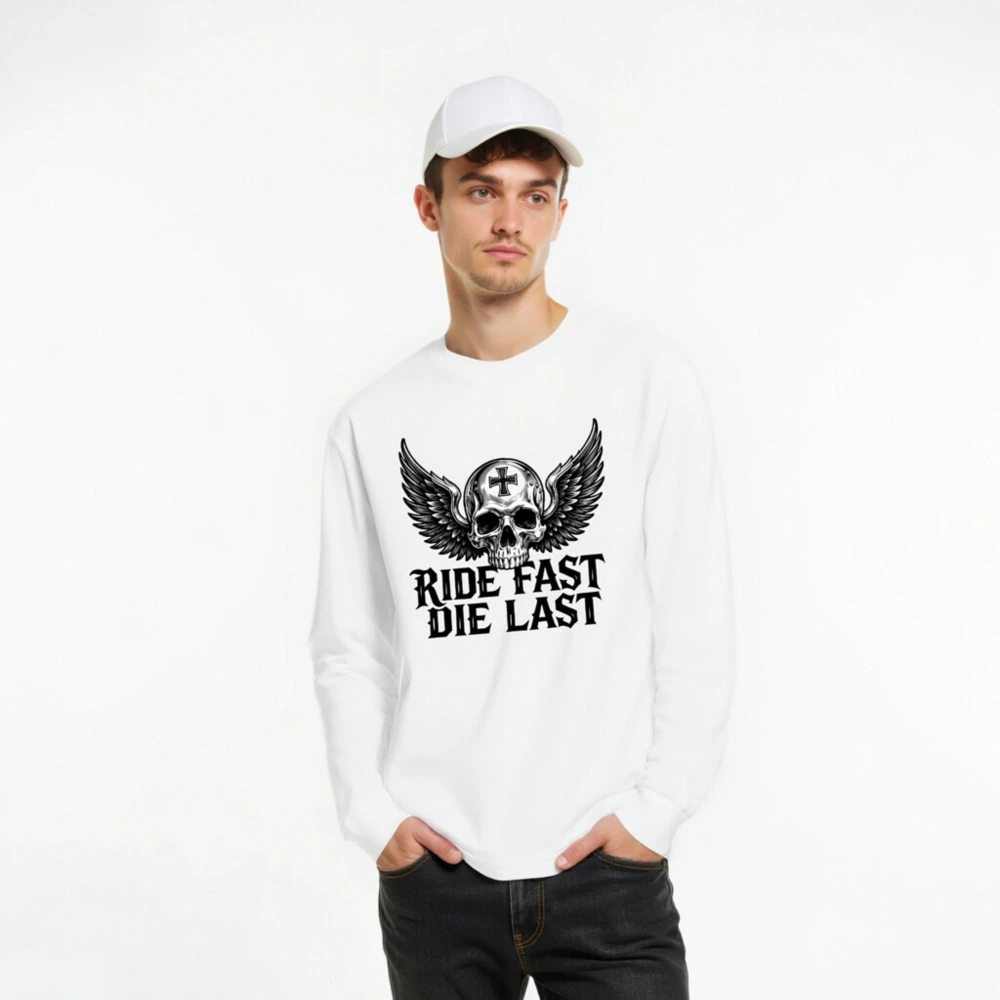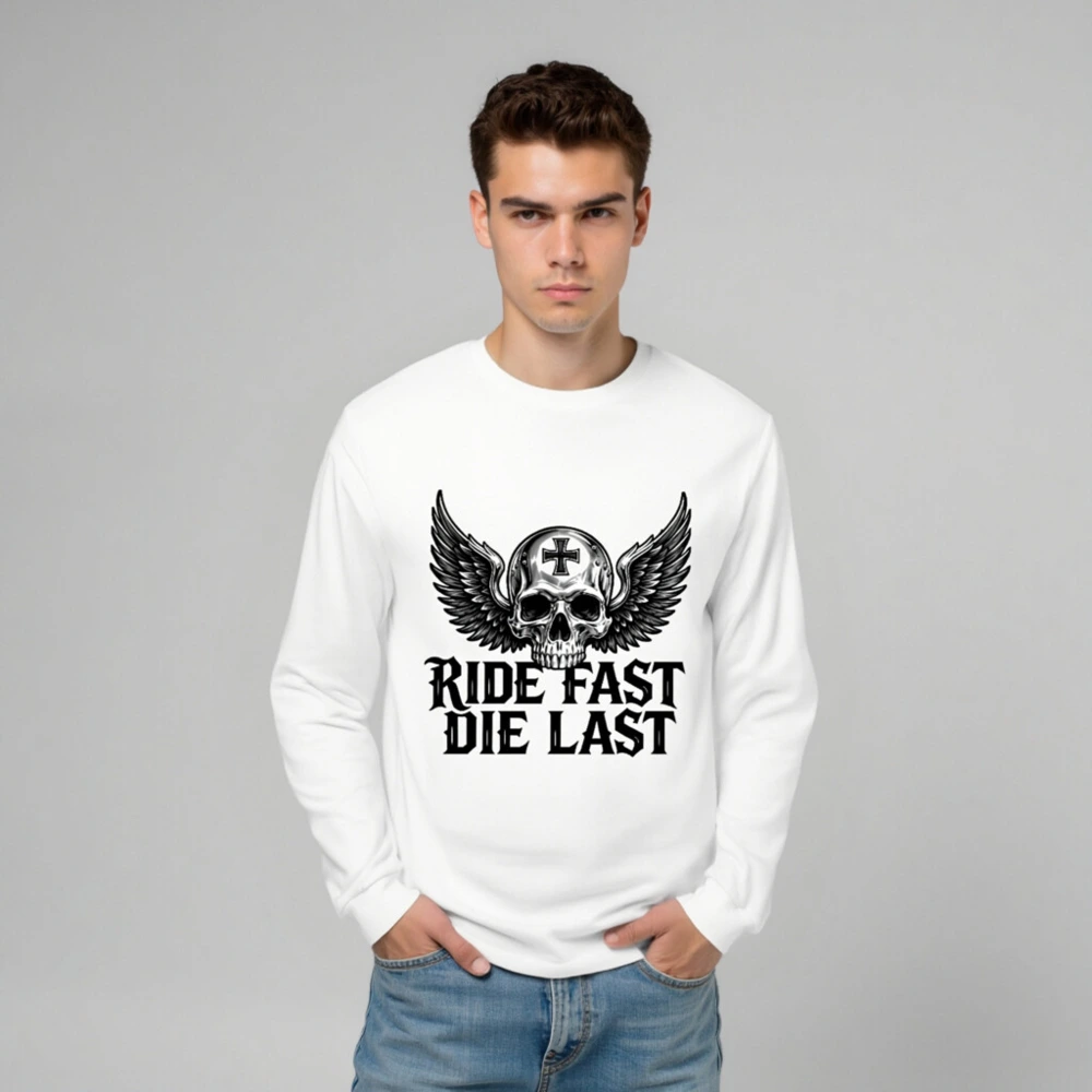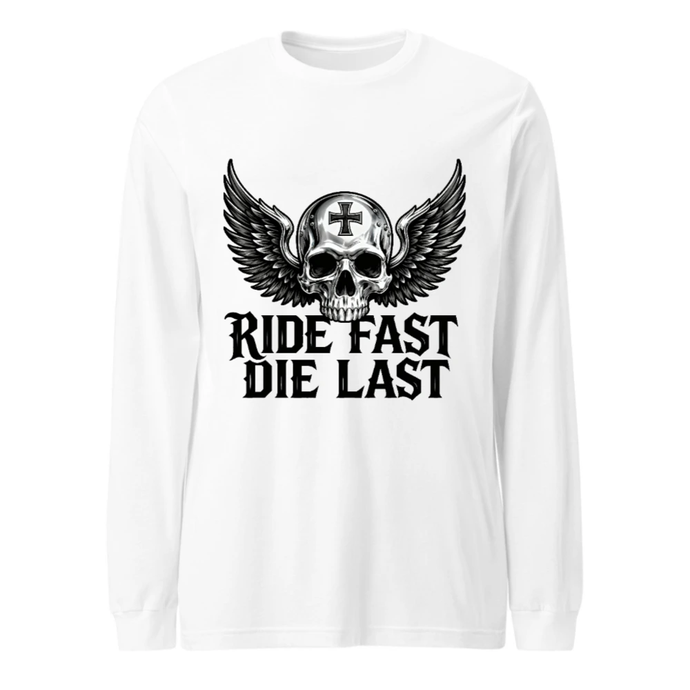 Unisex long sleeve tee featuring a bold winged skull with cross emblem and the iconic ‘Ride Fast Die Last’ slogan. Premium cotton blend, classic fit, perfect for biker culture and edgy streetwear. Designed for comfort and statement-making style—no extra embellishments, just raw attitude. Ideal for fans of motorcycle aesthetics and timeless dark design.