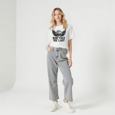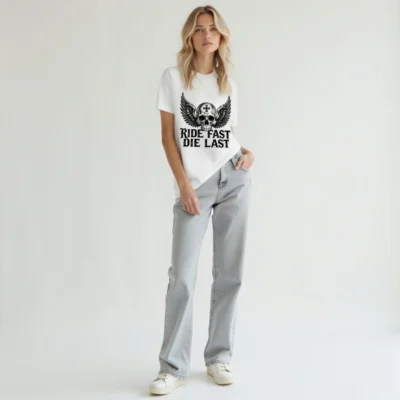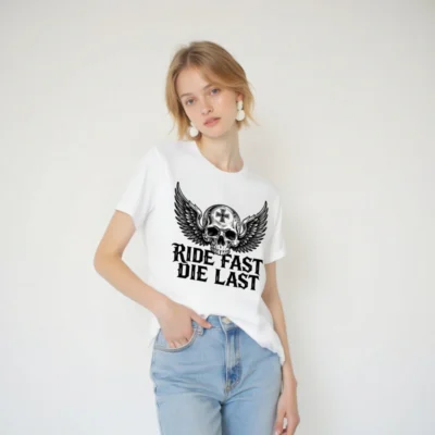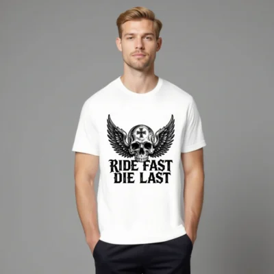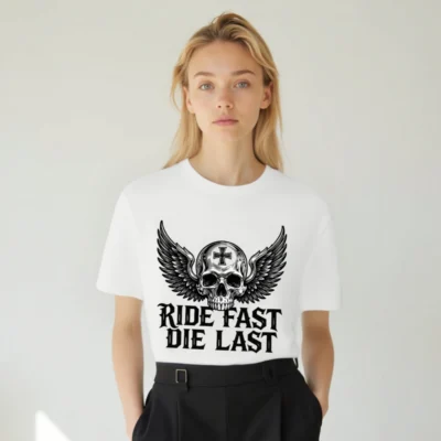 Bold unisex staple t-shirt featuring a striking winged skull with cross emblem and ‘RIDE FAST DIE LAST’ gothic text. Designed for motorcycle enthusiasts and biker culture lovers, this premium cotton tee combines edgy aesthetics with everyday comfort. Ideal for riders who embrace the outlaw spirit—no extra certifications or claims added, just authentic style.