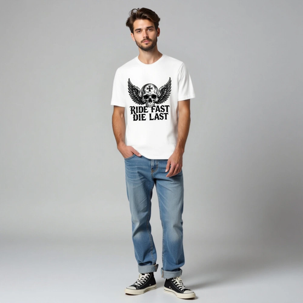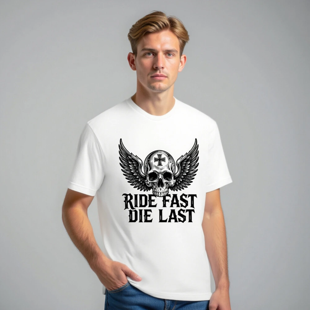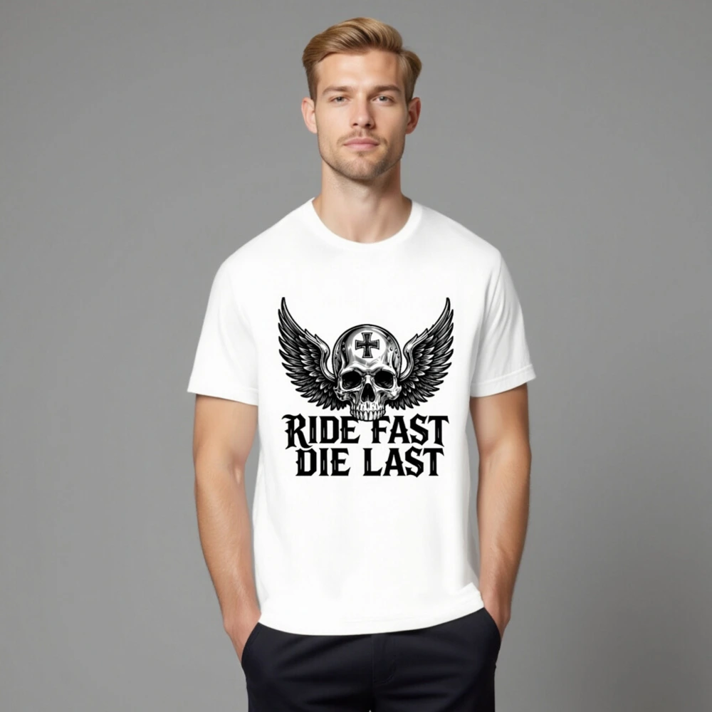Bold unisex staple t-shirt featuring a striking winged skull with cross emblem and ‘RIDE FAST DIE LAST’ gothic text. Designed for motorcycle enthusiasts and biker culture lovers, this premium cotton tee combines edgy aesthetics with everyday comfort. Ideal for riders who embrace the outlaw spirit—no extra certifications or claims added, just authentic style.