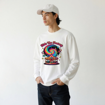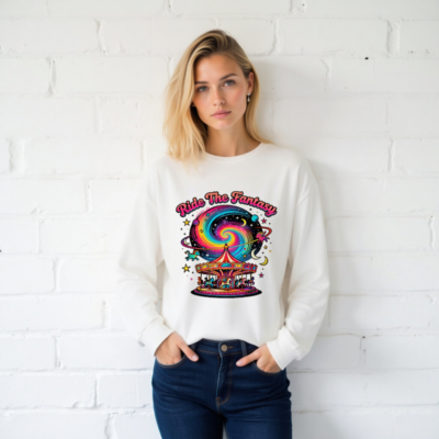 Unisex long sleeve tee featuring a vibrant ‘Ride The Fantasy’ design: a colorful carousel with whimsical animals set against a swirling rainbow galaxy, stars, and crescent moons. Perfect for fantasy lovers and cosmic enthusiasts. Soft cotton blend, comfortable fit, ideal for everyday wear or themed events. Available in all sizes.