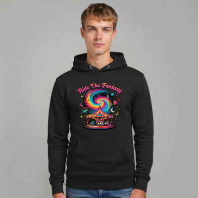 Step into wonder with this premium unisex pullover hoodie featuring a vibrant ‘Ride The Fantasy’ design: a magical carousel surrounded by swirling galaxies, stars, moons, and unicorns. Crafted for comfort with soft, durable fabric and classic hooded silhouette. Perfect for dreamers, fantasy lovers, and anyone seeking whimsical style. Ideal for casual wear, gifts, or expressing your inner magic.