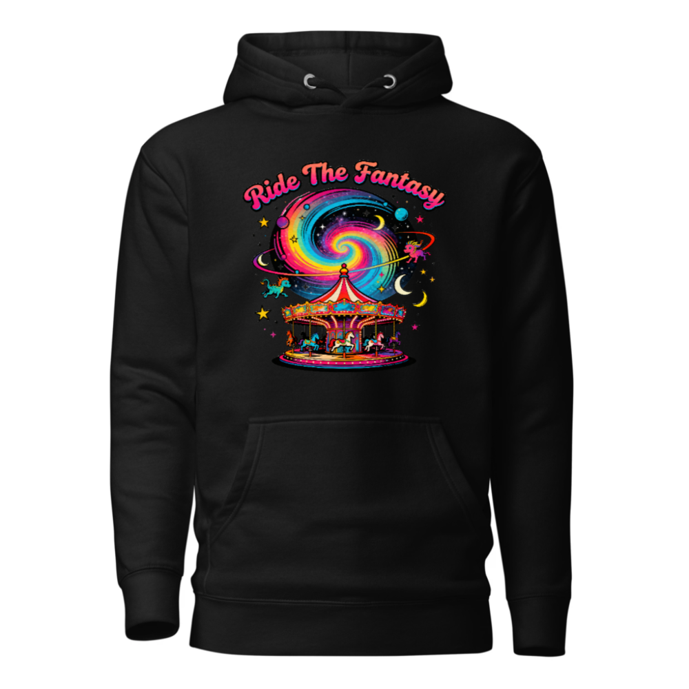 Step into wonder with this premium unisex pullover hoodie featuring a vibrant ‘Ride The Fantasy’ design: a magical carousel surrounded by swirling galaxies, stars, moons, and unicorns. Crafted for comfort with soft, durable fabric and classic hooded silhouette. Perfect for dreamers, fantasy lovers, and anyone seeking whimsical style. Ideal for casual wear, gifts, or expressing your inner magic.
