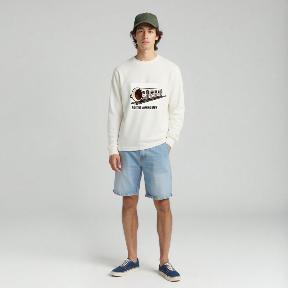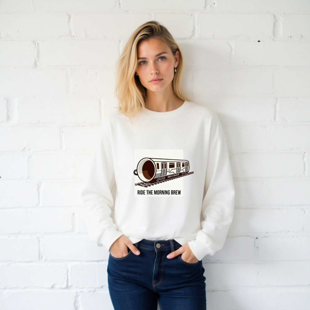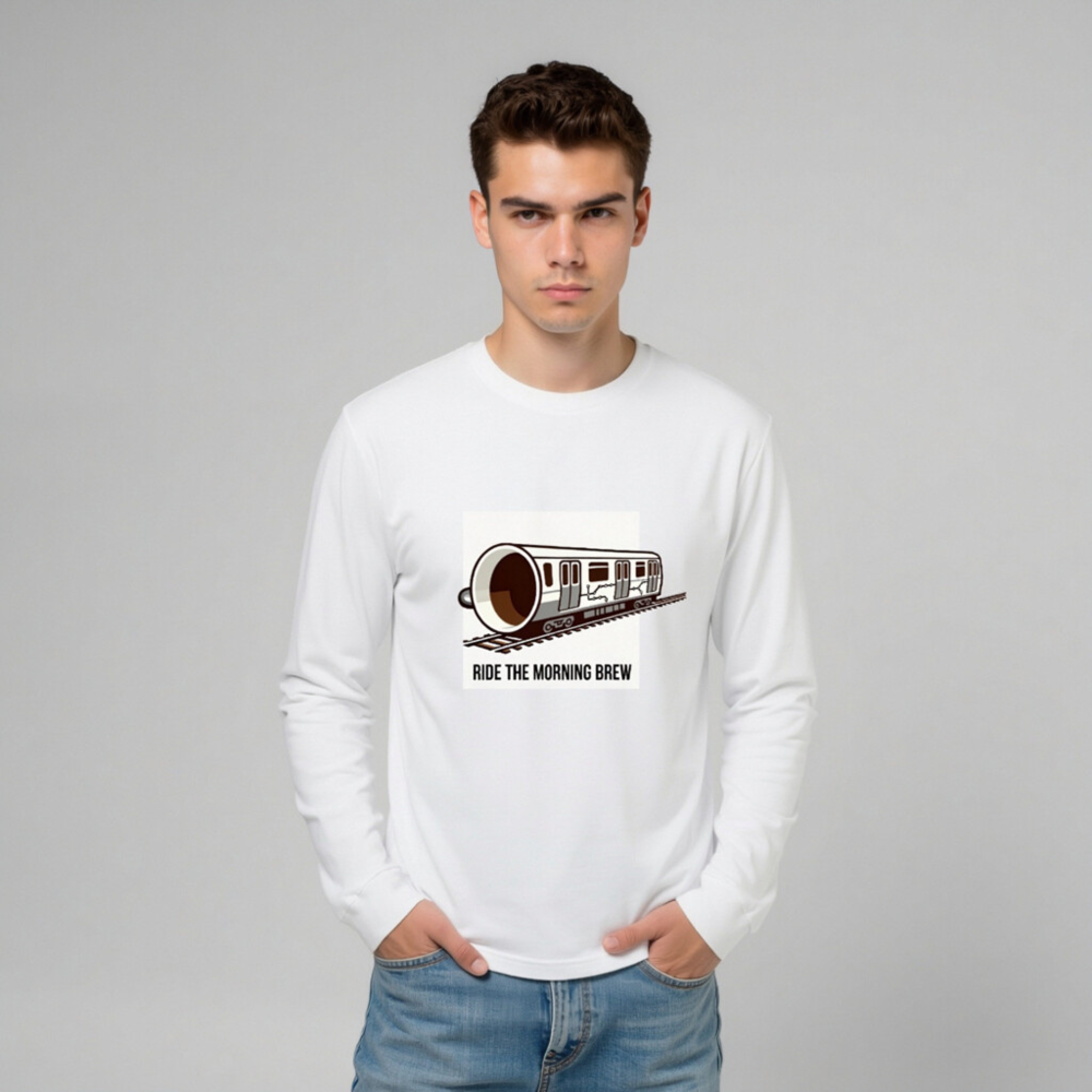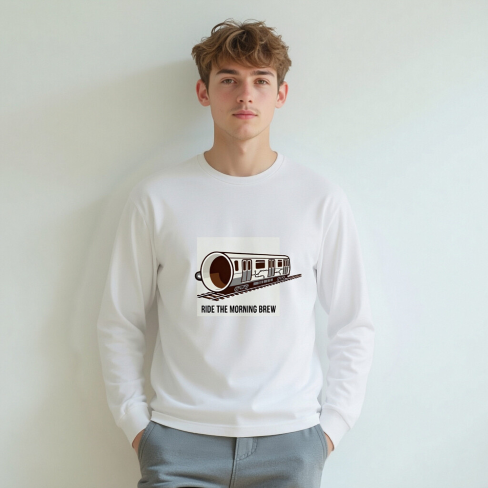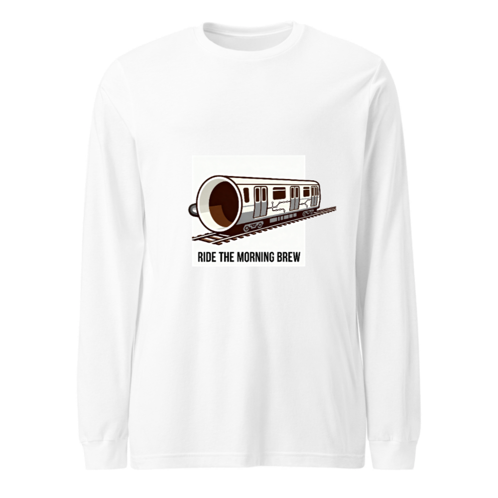A playful unisex long sleeve tee featuring a coffee cup train on tracks with the slogan ‘RIDE THE MORNING BREW’. Perfect for coffee lovers and transit enthusiasts. Soft, comfortable cotton blend. Designed for daily wear—start your day with a smile. Ideal gift for commuters and barista fans.