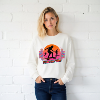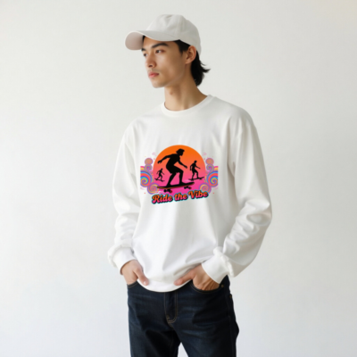Unisex long sleeve tee featuring bold ‘Ride the Vibe’ graphic with retro skateboarders, vibrant sunset swirls, and 100% cotton comfort. Perfect for casual wear, skate culture fans, or vintage-inspired fashion. Soft, breathable fabric—no added certifications or claims.