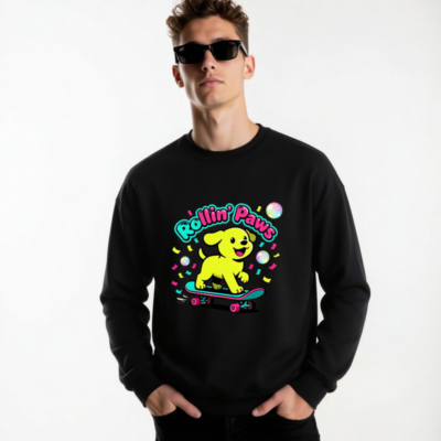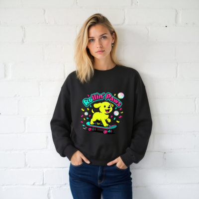 This unisex crew neck sweatshirt features a vibrant ‘Rollin’ Paws’ design: a cheerful yellow puppy riding a teal skateboard with pink wheels, surrounded by colorful confetti and iridescent bubbles. Made for comfort and style, it’s perfect for casual wear. The playful graphic captures retro-futuristic charm—ideal for dog lovers and skate culture fans. Soft, relaxed fit; machine washable. No certifications or claims added beyond what’s visibly stated.