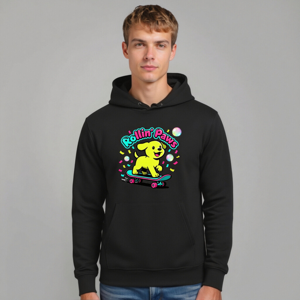 Show off your playful side with this unisex essential eco hoodie featuring a vibrant ‘Rollin’ Paws’ design: a cheerful yellow puppy riding a skateboard amid confetti and bubbles. Made from sustainable materials, it’s comfortable, stylish, and perfect for casual wear. The bold graphic stands out on the black fabric, blending fun and eco-conscious fashion. Ideal for dog lovers and skate culture fans seeking quality and character.