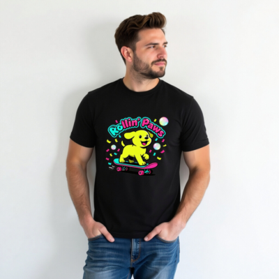 Show off your love for pets and skate culture with this vibrant unisex staple t-shirt. Features a cheerful yellow puppy riding a skateboard, surrounded by colorful confetti and holographic bubbles—perfect for casual wear. Soft cotton blend, classic fit, gender-neutral style. Ideal for dog lovers, skaters, or anyone who enjoys playful, retro-inspired designs.