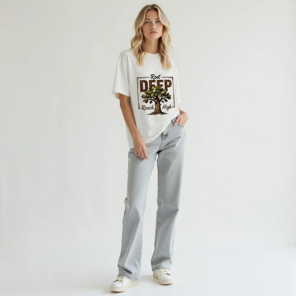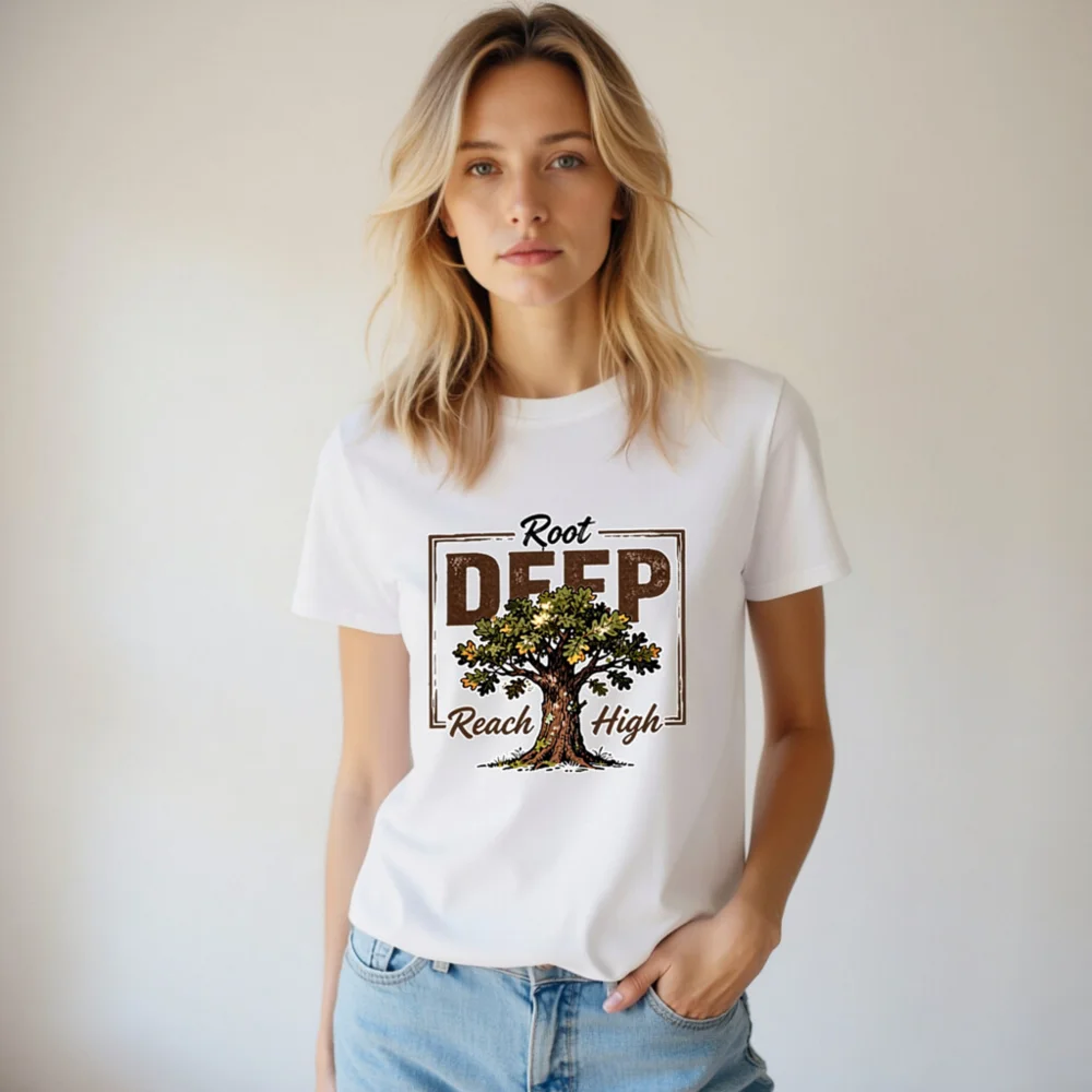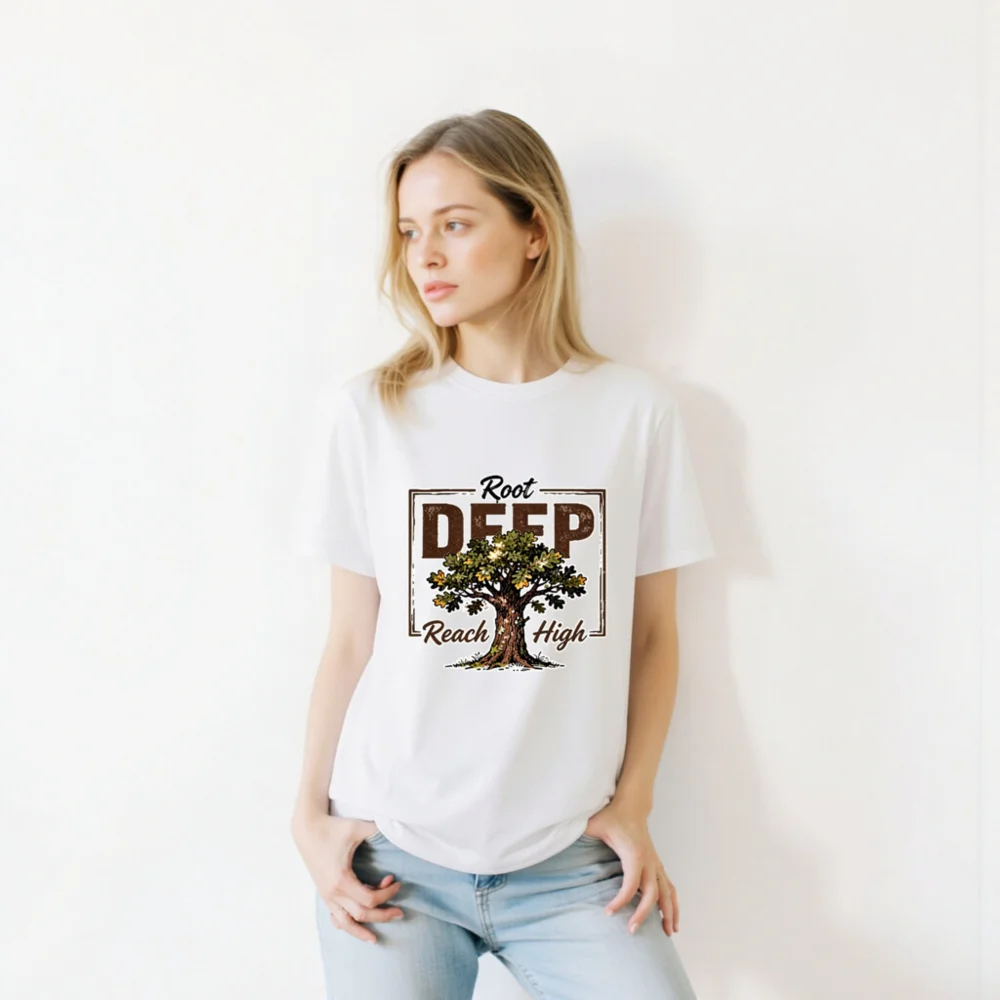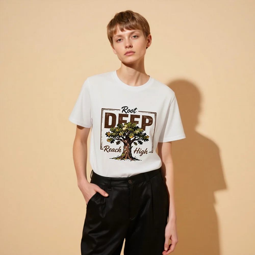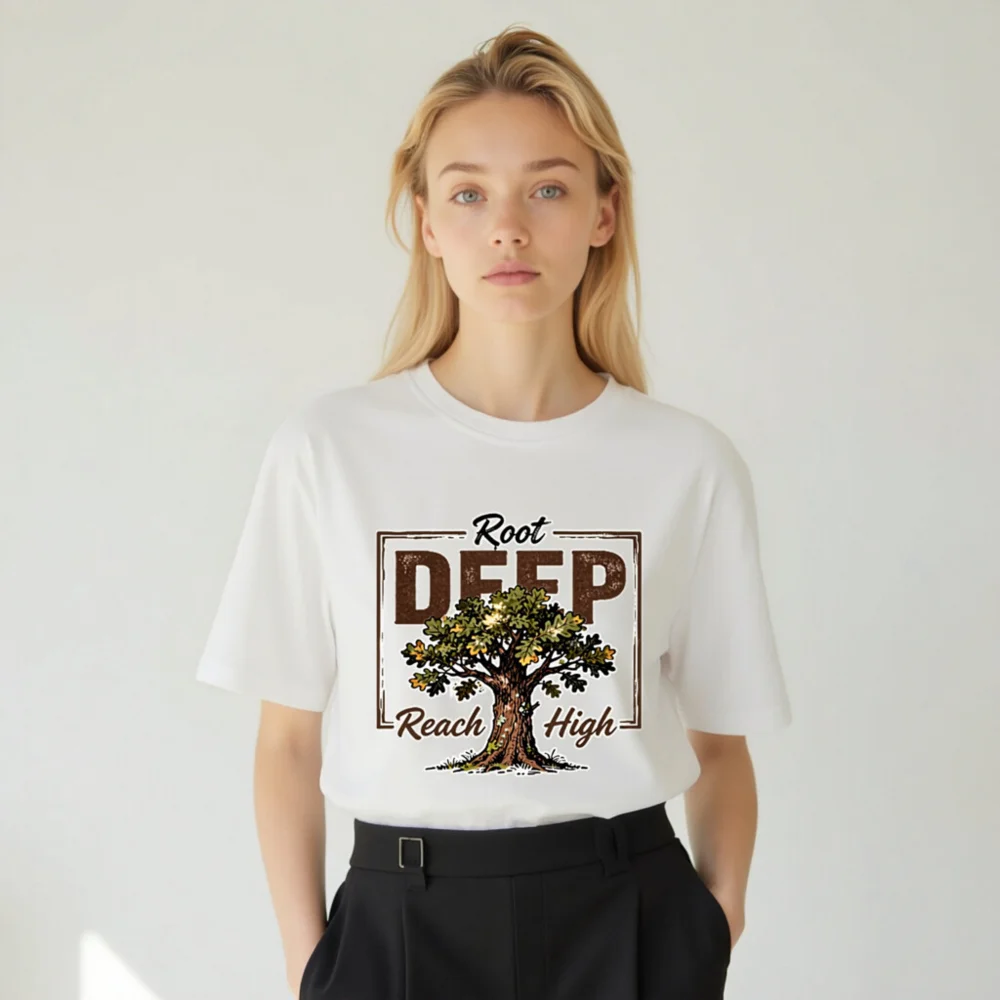 This eco-friendly unisex t-shirt is crafted from 100% organic cotton for soft comfort and sustainability. Featuring the inspiring ‘Root Deep, Reach High’ tree graphic—symbolizing strength, growth, and resilience—it’s perfect for nature lovers and mindful wearers. Designed with a classic fit, it suits everyday wear, outdoor adventures, or casual layering. Ideal for men and women seeking meaningful, planet-conscious fashion. Durable print, OEKO-TEX® certified dyes, and ethical production ensure quality you can trust.