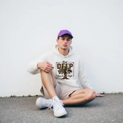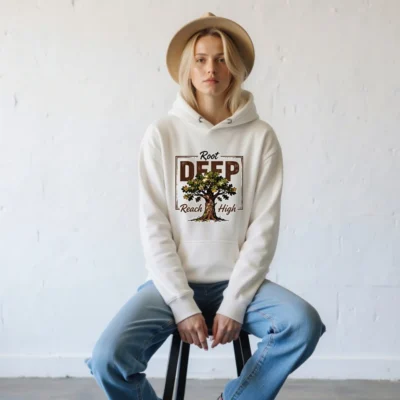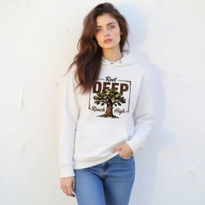 This unisex premium pullover hoodie features a meaningful ‘Root Deep, Reach High’ tree design—symbolizing strength, growth, and resilience. Made from soft, durable cotton-blend fabric with a classic fit, front kangaroo pocket, and adjustable drawstring hood. Ideal for casual wear, gifting, or motivational apparel. Perfect for nature lovers, students, educators, and anyone inspired by personal growth. Machine washable, eco-conscious print, and designed for everyday comfort and style.