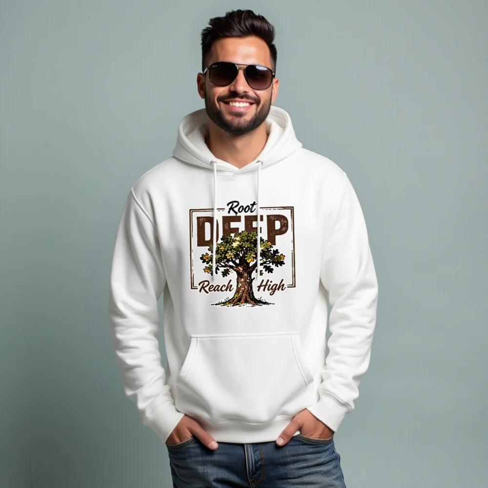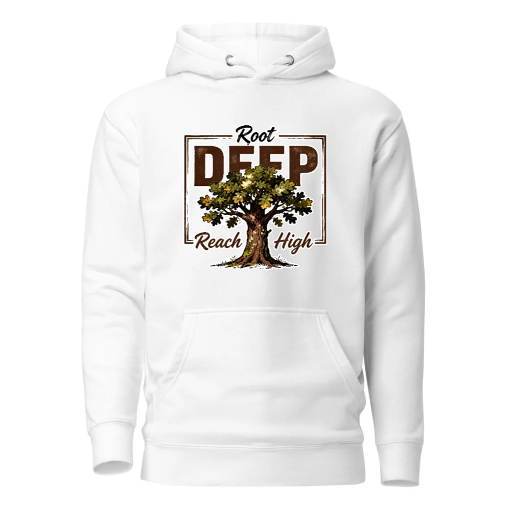This unisex premium pullover hoodie features a meaningful ‘Root Deep, Reach High’ tree design—symbolizing strength, growth, and resilience. Made from soft, durable cotton-blend fabric with a classic fit, front kangaroo pocket, and adjustable drawstring hood. Ideal for casual wear, gifting, or motivational apparel. Perfect for nature lovers, students, educators, and anyone inspired by personal growth. Machine washable, eco-conscious print, and designed for everyday comfort and style.
