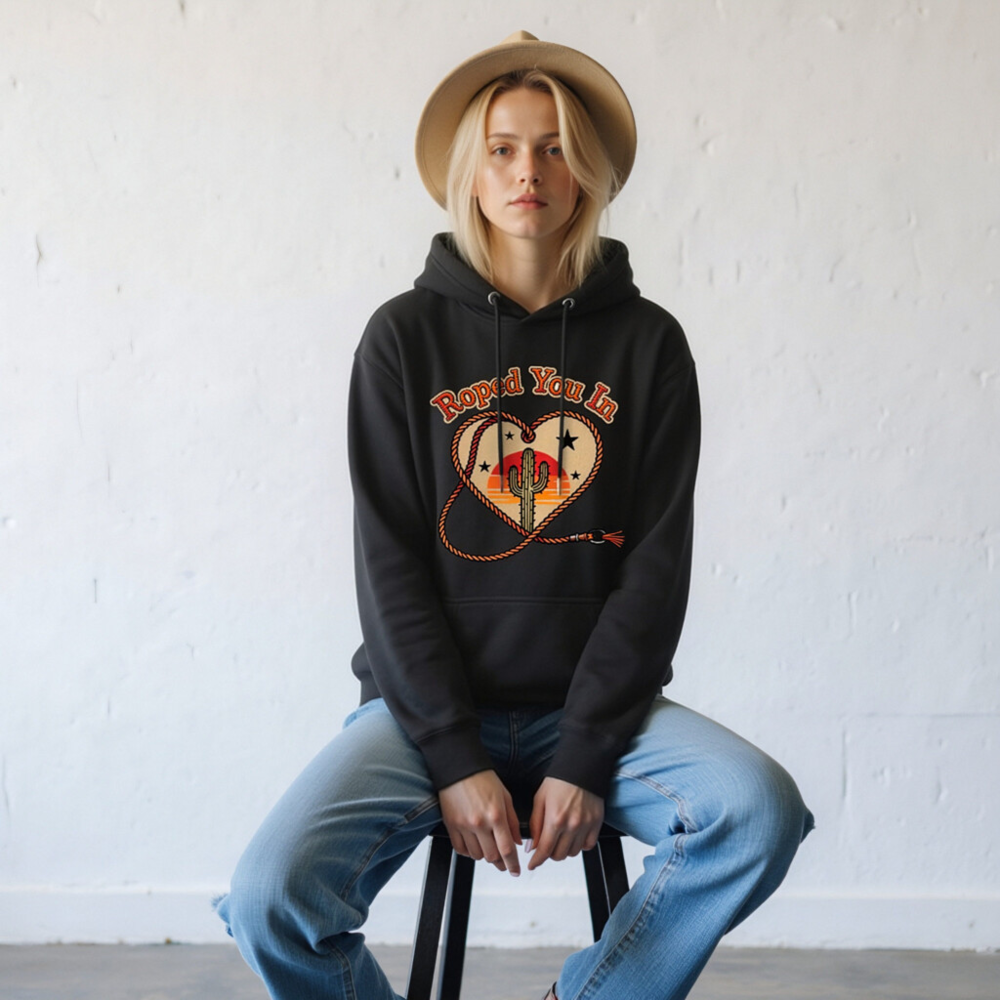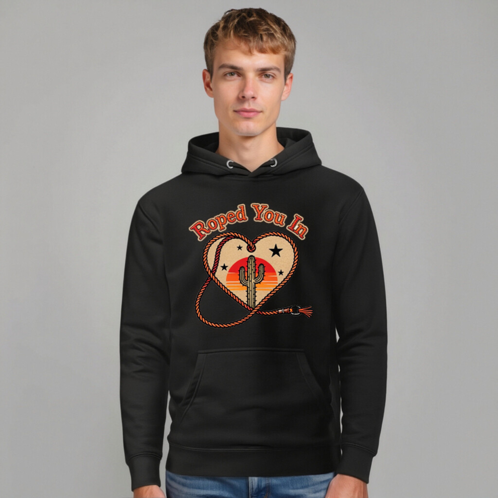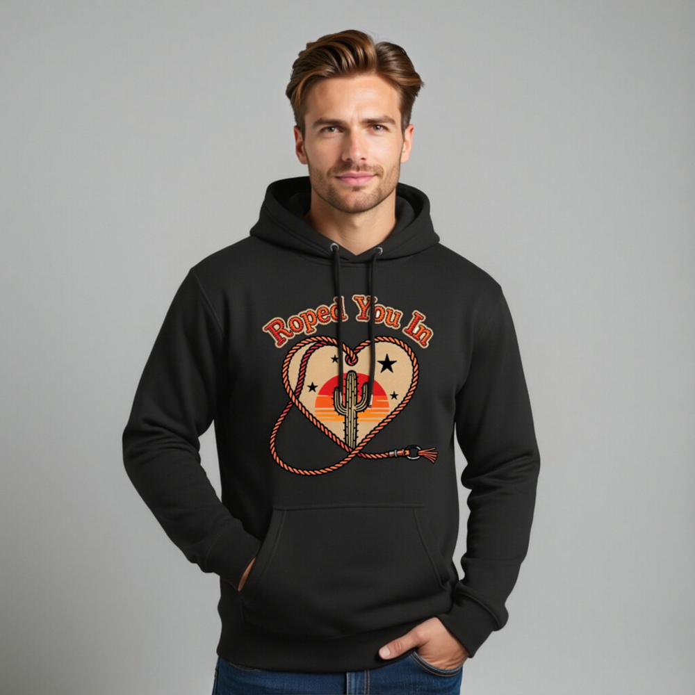 This unisex premium pullover hoodie features a vintage-style ‘Roped You In’ design with a rope-formed heart, iconic saguaro cactus, desert sunset, and stars. Crafted for comfort and style, it’s ideal for Western lovers, nature enthusiasts, and anyone who embraces rustic charm. Soft fabric, classic fit, and eye-catching graphic make this a standout everyday piece.
