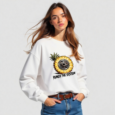 Boldly merge tropical flair with mechanical rebellion: this unisex crew neck sweatshirt features a striking pineapple sliced open to reveal an intricate gear mechanism at its core. The graphic ‘RUNCH THE SYSTEM’ adds edgy, anti-establishment flair—perfect for those who value individuality and bold self-expression. Soft, comfortable fit; ideal for casual wear or statement layering.