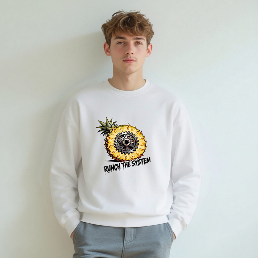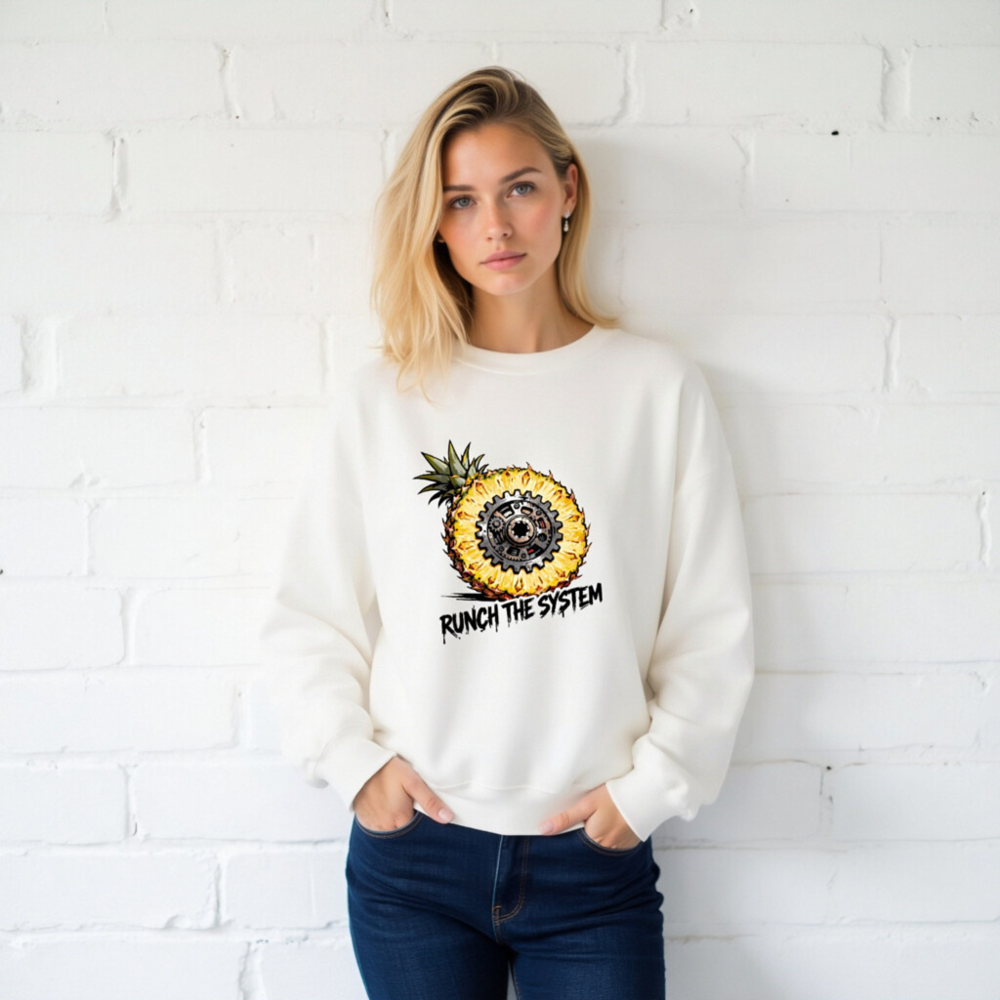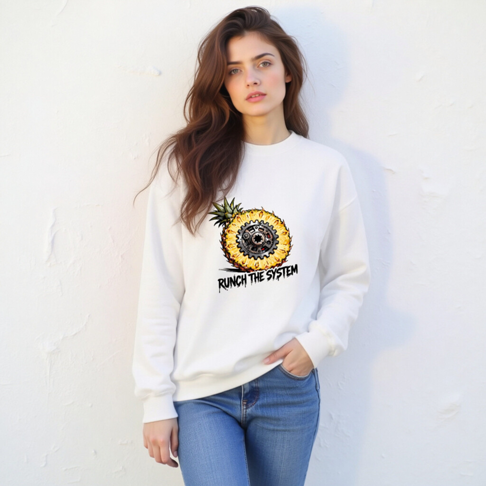 Boldly merge tropical flair with mechanical rebellion: this unisex crew neck sweatshirt features a striking pineapple sliced open to reveal an intricate gear mechanism at its core. The graphic ‘RUNCH THE SYSTEM’ adds edgy, anti-establishment flair—perfect for those who value individuality and bold self-expression. Soft, comfortable fit; ideal for casual wear or statement layering.