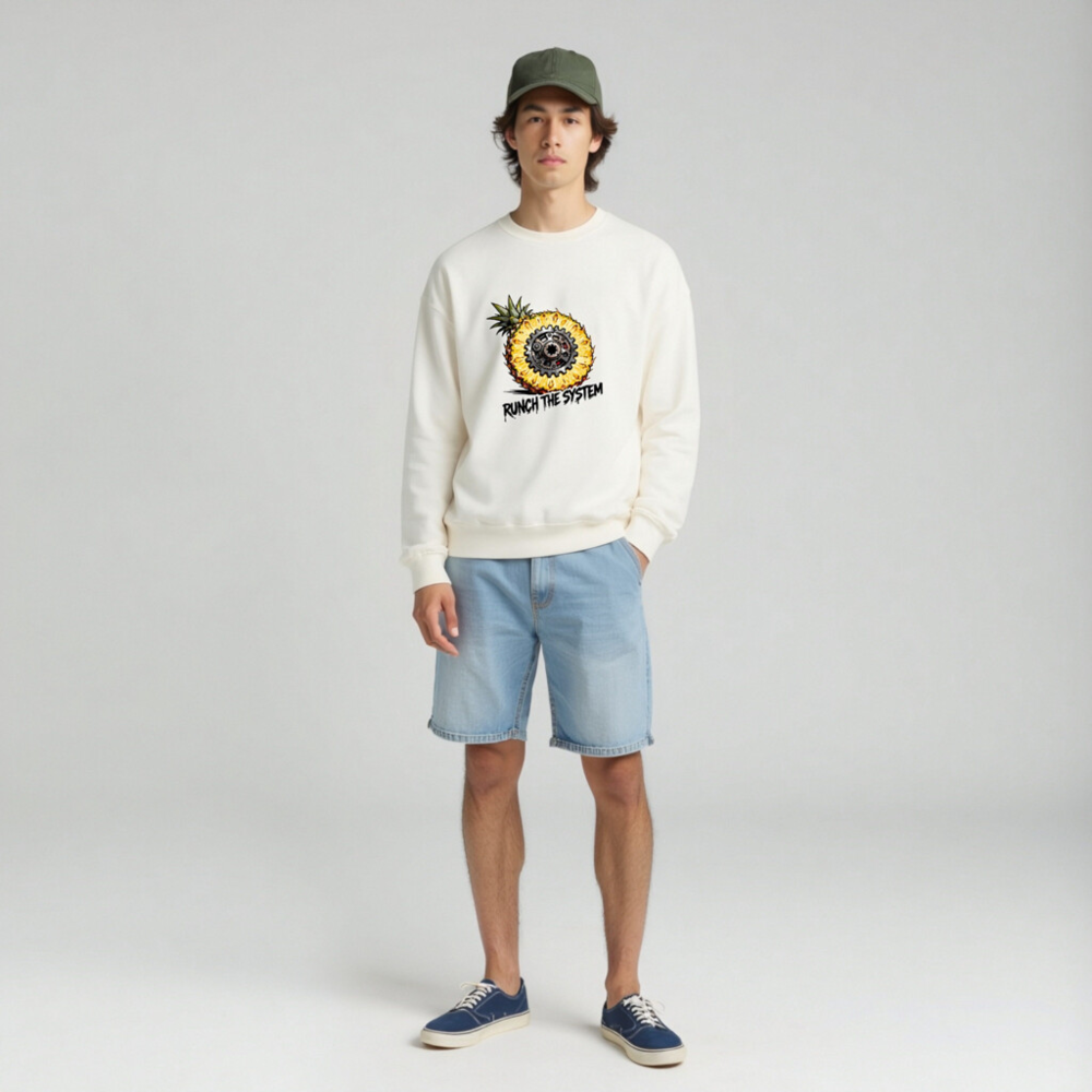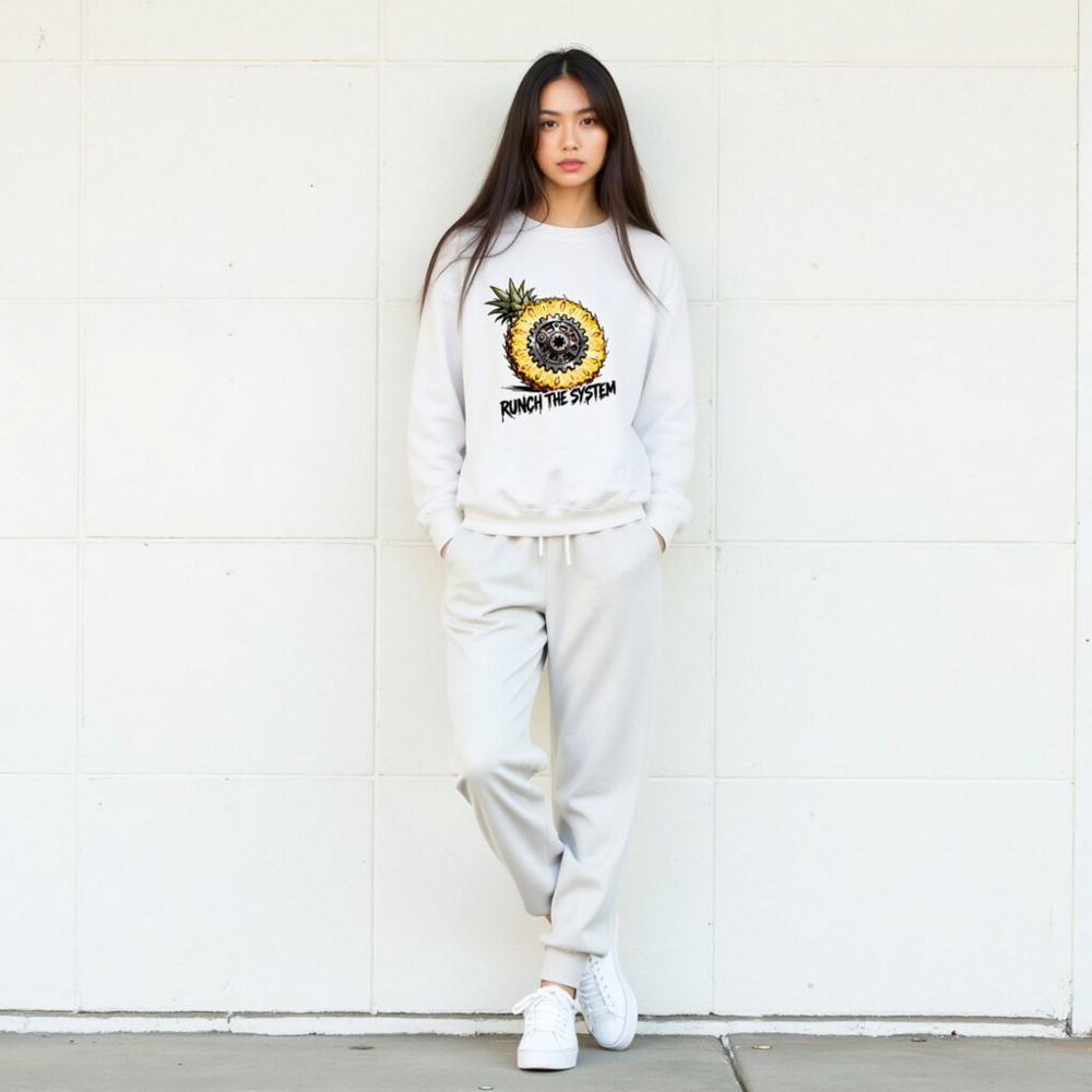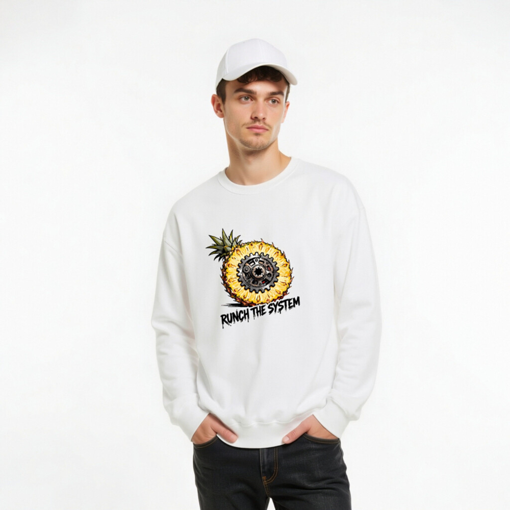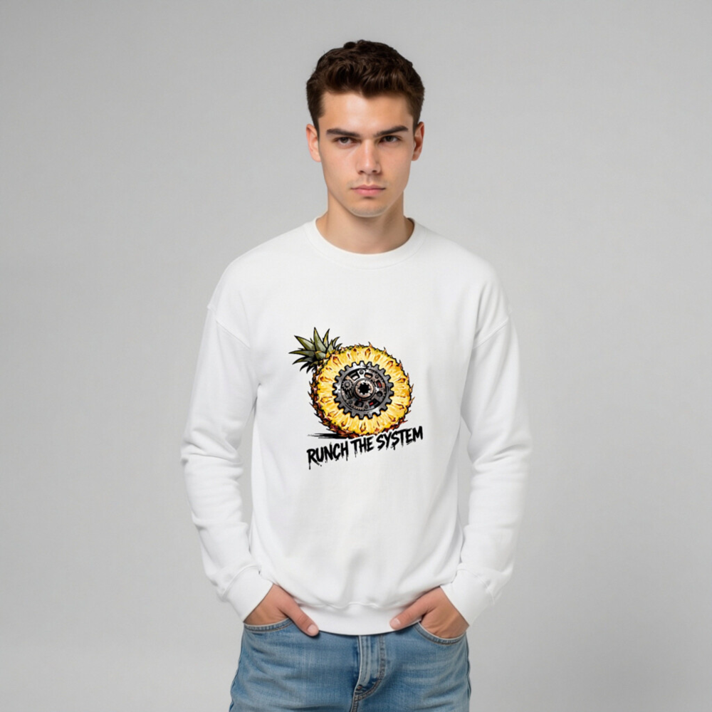 Boldly merge tropical flair with mechanical rebellion: this unisex crew neck sweatshirt features a striking pineapple sliced open to reveal an intricate gear mechanism at its core. The graphic ‘RUNCH THE SYSTEM’ adds edgy, anti-establishment flair—perfect for those who value individuality and bold self-expression. Soft, comfortable fit; ideal for casual wear or statement layering.
