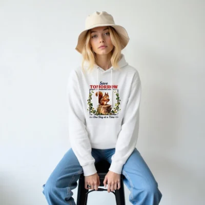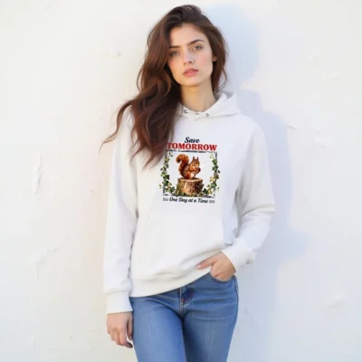 This unisex eco hoodie features a charming ‘Save Tomorrow, One Day at a Time’ print with a squirrel on a tree stump, framed by ivy—perfect for nature lovers and sustainability advocates. Made from soft, eco-conscious fabric, it offers comfort and style for everyday wear. Ideal for casual outings, gifting, or spreading mindful living messages. Lightweight, durable, and gender-neutral, this hoodie blends environmental awareness with wearable art. A thoughtful choice for those who care about the planet—one day at a time.