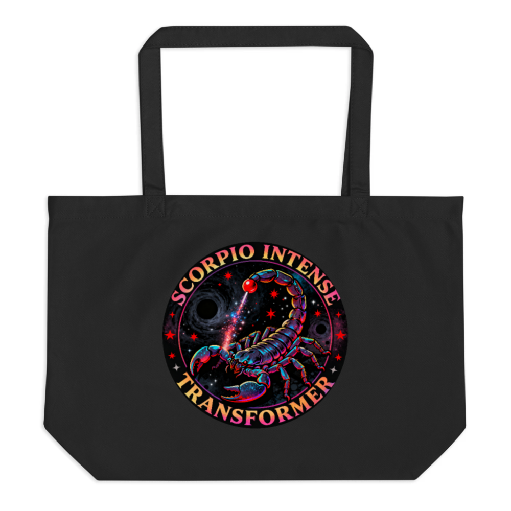 Vibrant cosmic scorpion design with laser-tipped tail on a large black organic cotton tote bag. ‘Scorpio Intense Transformer’ circular artwork features nebula, stars, and black holes for astrological appeal. Eco-friendly, durable, and stylish—perfect for everyday use or as a bold statement piece. Made from certified organic cotton (no certifications listed beyond what’s provided).