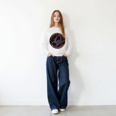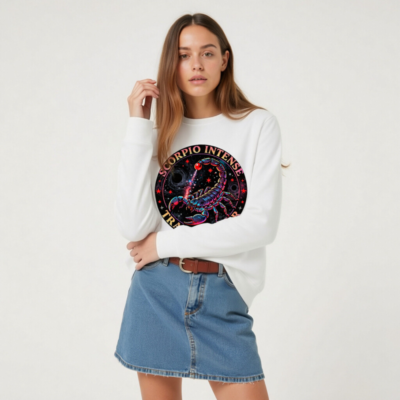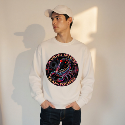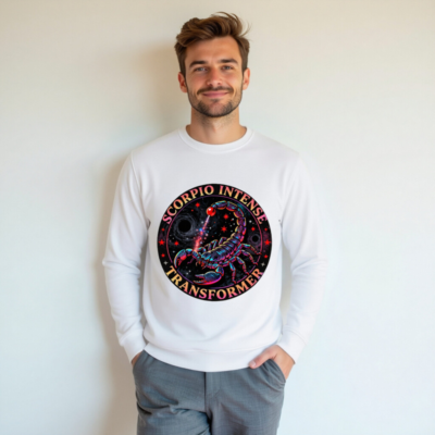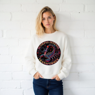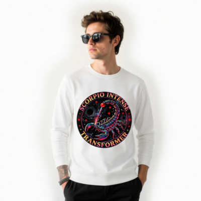 Wear the cosmic power of Scorpio with this vibrant unisex organic sweatshirt. Features a neon-lit scorpion design firing a red beam against a starry black hole backdrop, encircled by ‘SCORPIO INTENSE TRANSFORMER’ text. Made from certified organic cotton for comfort and sustainability. Perfect for astrology lovers, zodiac fans, and bold fashion statements.