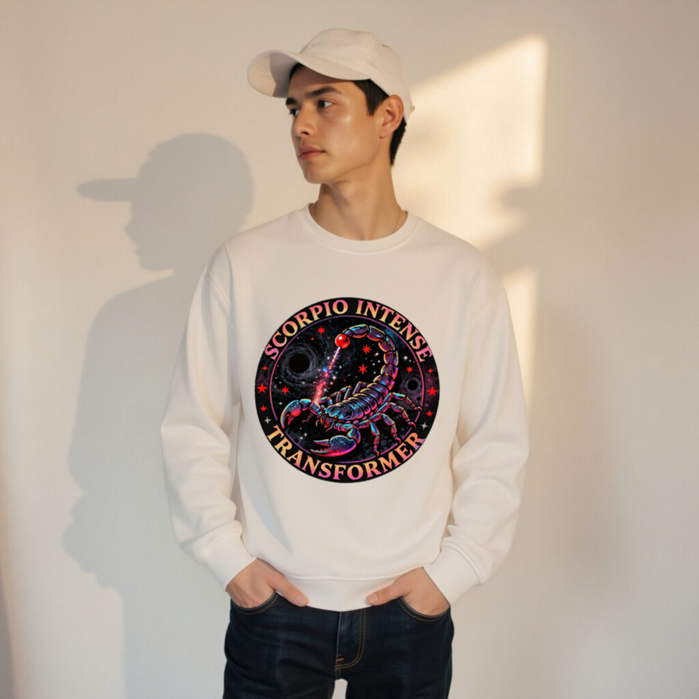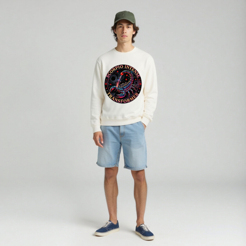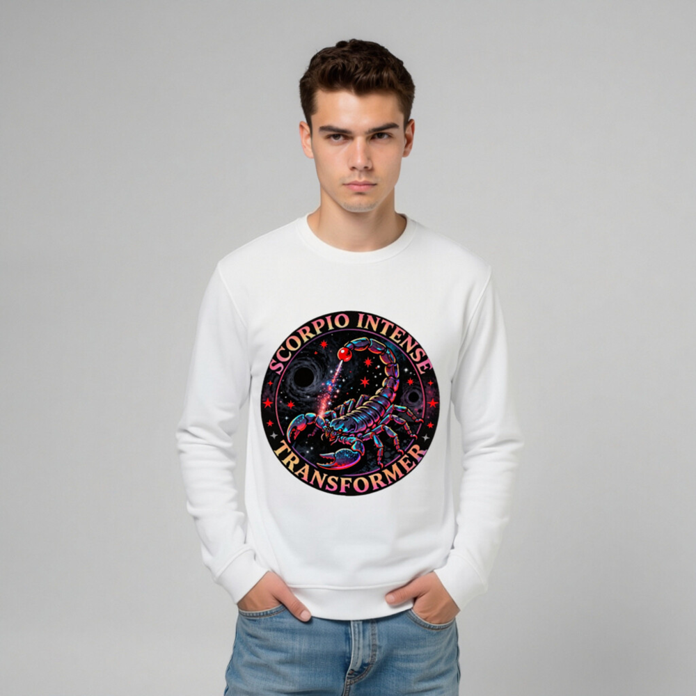 Wear the cosmic power of Scorpio with this vibrant unisex organic sweatshirt. Features a neon-lit scorpion design firing a red beam against a starry black hole backdrop, encircled by ‘SCORPIO INTENSE TRANSFORMER’ text. Made from certified organic cotton for comfort and sustainability. Perfect for astrology lovers, zodiac fans, and bold fashion statements.