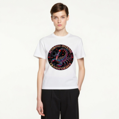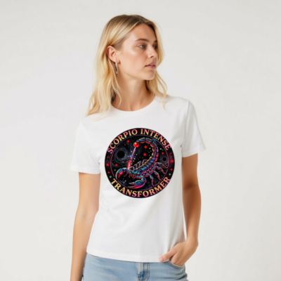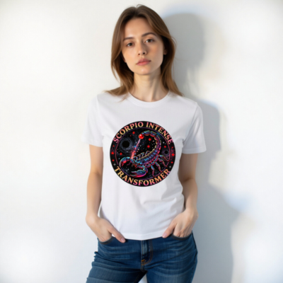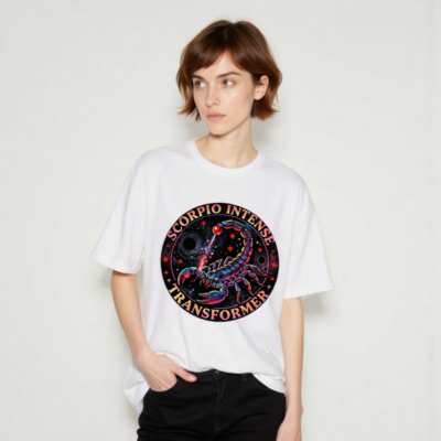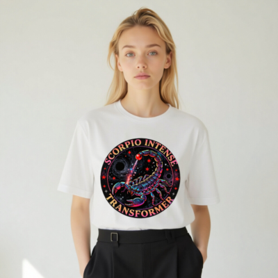 Wear the cosmic power of Scorpio with this unisex staple t-shirt featuring a vibrant, neon-lit scorpion against a starry black hole backdrop. ‘Scorpio Intense Transformer’ text wraps the bold circular graphic—perfect for astrology lovers and sci-fi fans. Soft cotton blend, classic fit, gender-neutral style. Ideal for everyday wear or zodiac-themed gifts. Designed to stand out with vivid colors and cosmic energy.