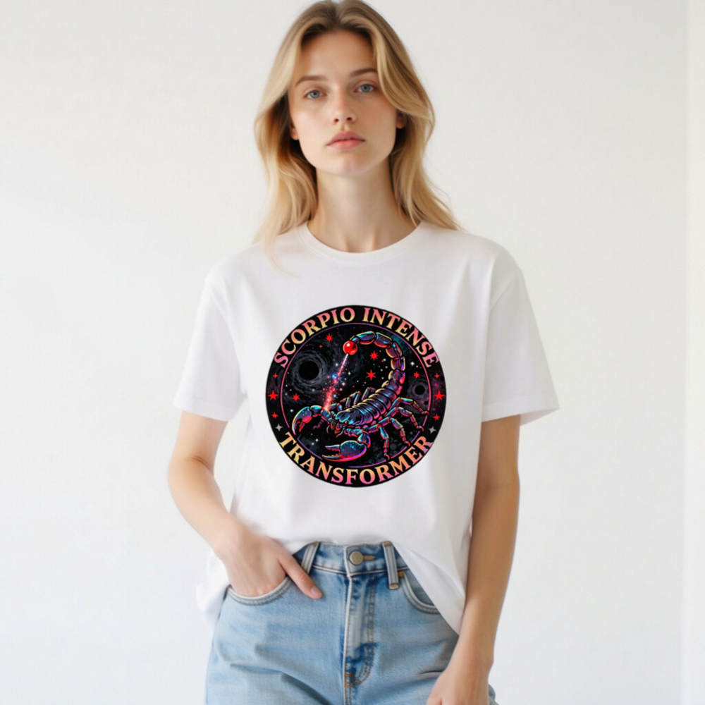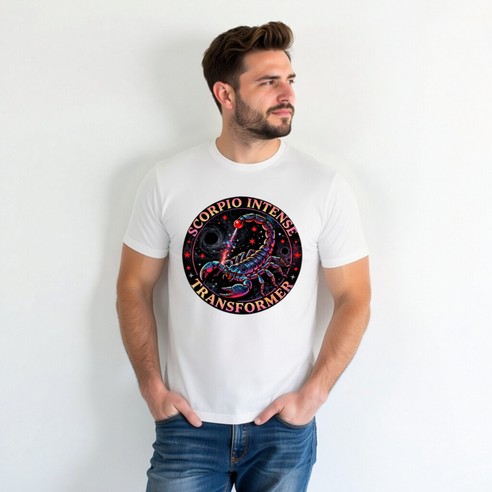 Wear the cosmic power of Scorpio with this unisex staple t-shirt featuring a vibrant, neon-lit scorpion against a starry black hole backdrop. ‘Scorpio Intense Transformer’ text wraps the bold circular graphic—perfect for astrology lovers and sci-fi fans. Soft cotton blend, classic fit, gender-neutral style. Ideal for everyday wear or zodiac-themed gifts. Designed to stand out with vivid colors and cosmic energy.
