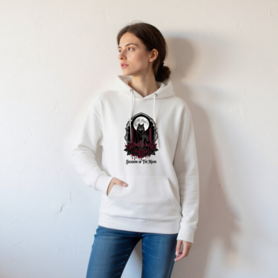 A premium unisex pullover hoodie featuring a striking Gothic design: a lone wolf beneath a full moon, framed by an arched window with thorned vines and deep red roses. Soft, comfortable fabric with a classic front pouch pocket. Ideal for dark fantasy lovers—timeless style, everyday wear, and bold self-expression.