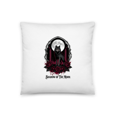 Elegant 18″x18″ basic pillow featuring a striking ‘Shadow of the Moon’ design: a black wolf beneath a full moon, framed by gothic arches and blood-red roses. Perfect for gothic, fantasy, or cozy bedroom decor. Soft, high-quality fabric. Ideal gift for wolf lovers and moon enthusiasts.