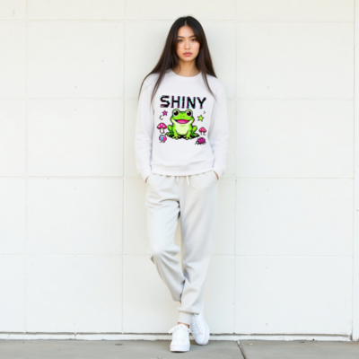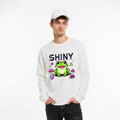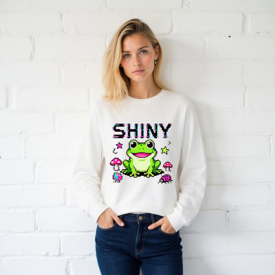 Adorable pixel-art frog with big eyes and a cheerful smile, surrounded by pink mushrooms, ladybug, and stars. This unisex long sleeve tee features vibrant retro gaming aesthetics and a playful ‘SHINY’ glitch-text effect. Perfect for gamers, nature lovers, and fans of kawaii pixel art. Soft cotton blend, comfortable fit, casual everyday wear.