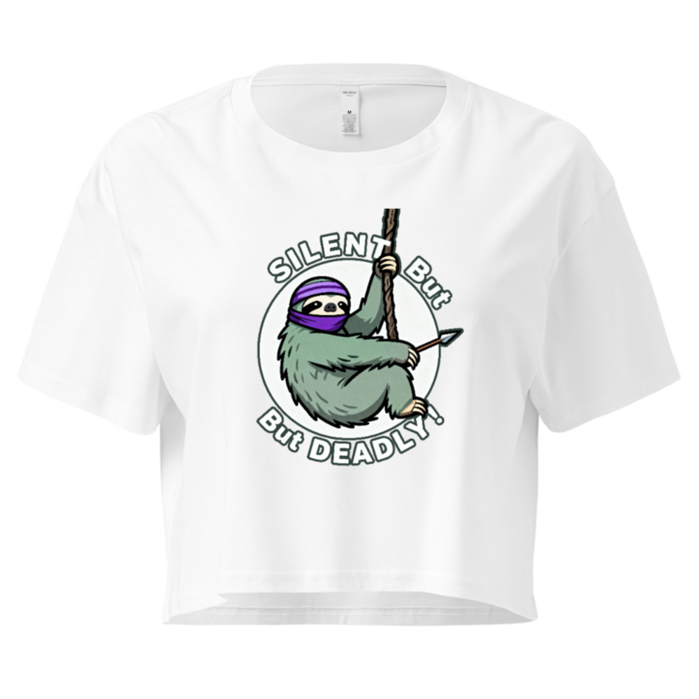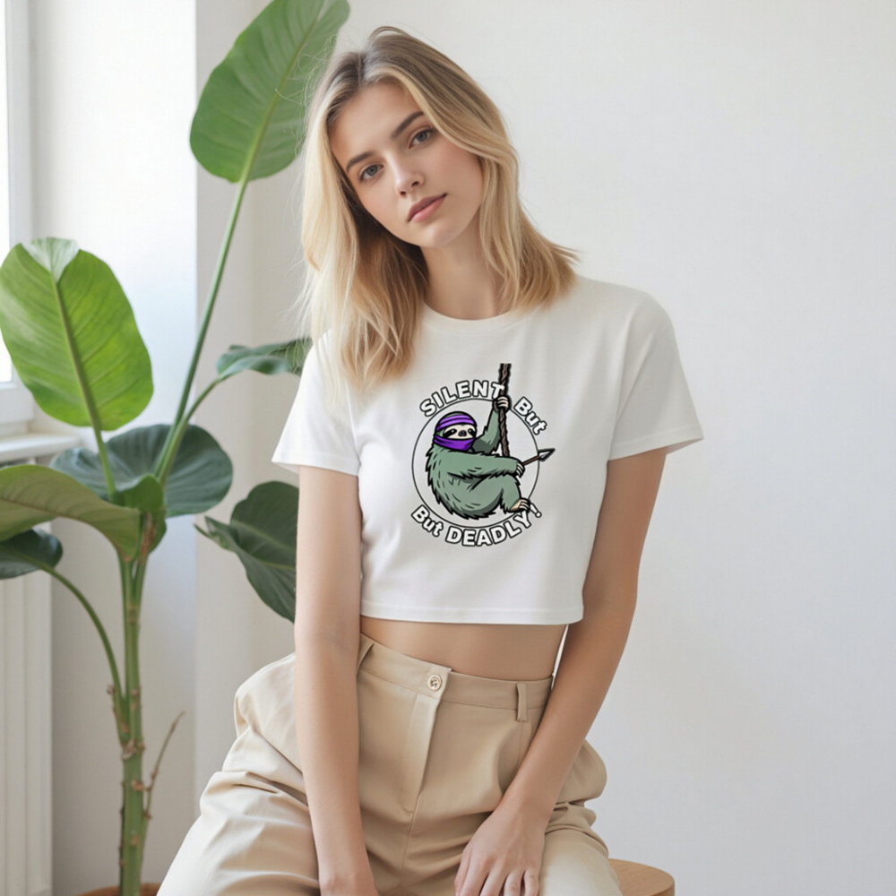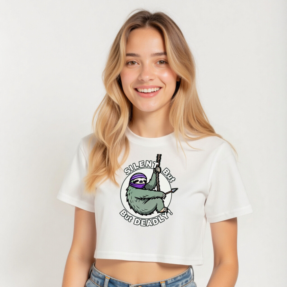 Women’s crop top featuring a humorous sloth ninja design with purple headband, holding rope and spear. ‘SILENT But DEADLY!’ text in bold circular graphic. Soft cotton blend, stylish fit for casual wear. Perfect gift for animal lovers & humor fans. Comfortable, trendy, and eye-catching.