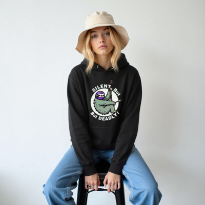 This unisex premium pullover hoodie features a bold graphic of a ninja sloth with the iconic phrase ‘Silent But Deadly!’—perfect for fans of humor, animal lovers, and pop culture. Made for comfort and style, it’s a versatile everyday piece. The design combines playful cartoon art with a classic slogan, appealing to casual wearers seeking unique, statement apparel.