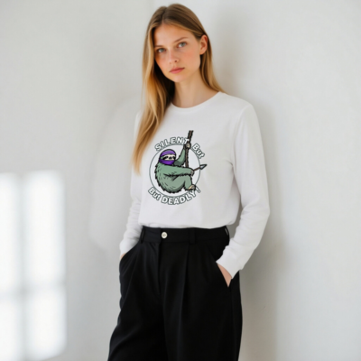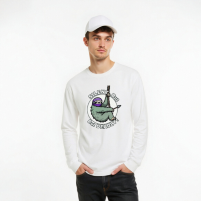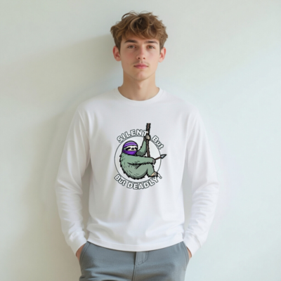 This unisex long sleeve tee features a playful sloth ninja graphic—purple headband, rope grip, and dart in hand—encircled by the bold phrase ‘SILENT But But DEADLY!’. Designed for comfort and humor, it’s perfect for fans of quirky animal art and pop-culture puns. Lightweight cotton blend, classic fit, great for casual wear or as a fun gift.