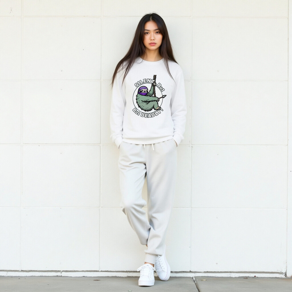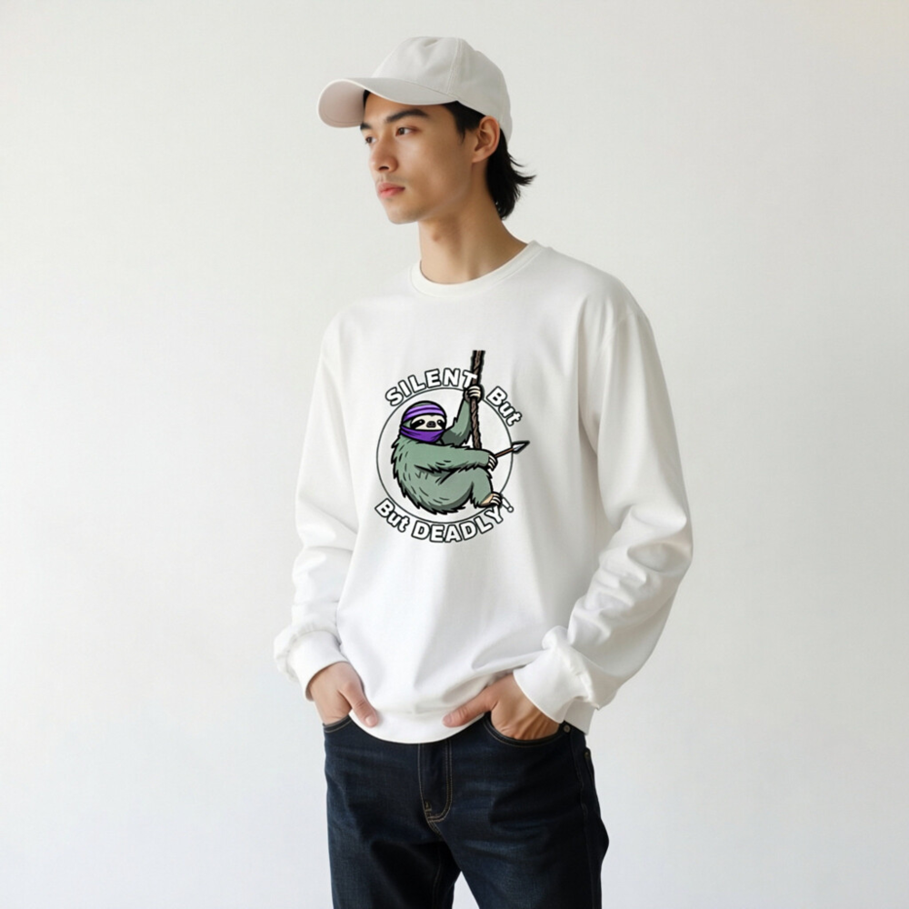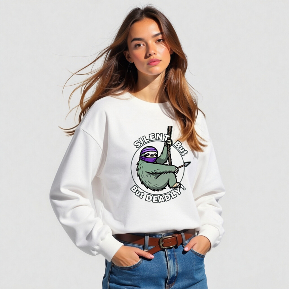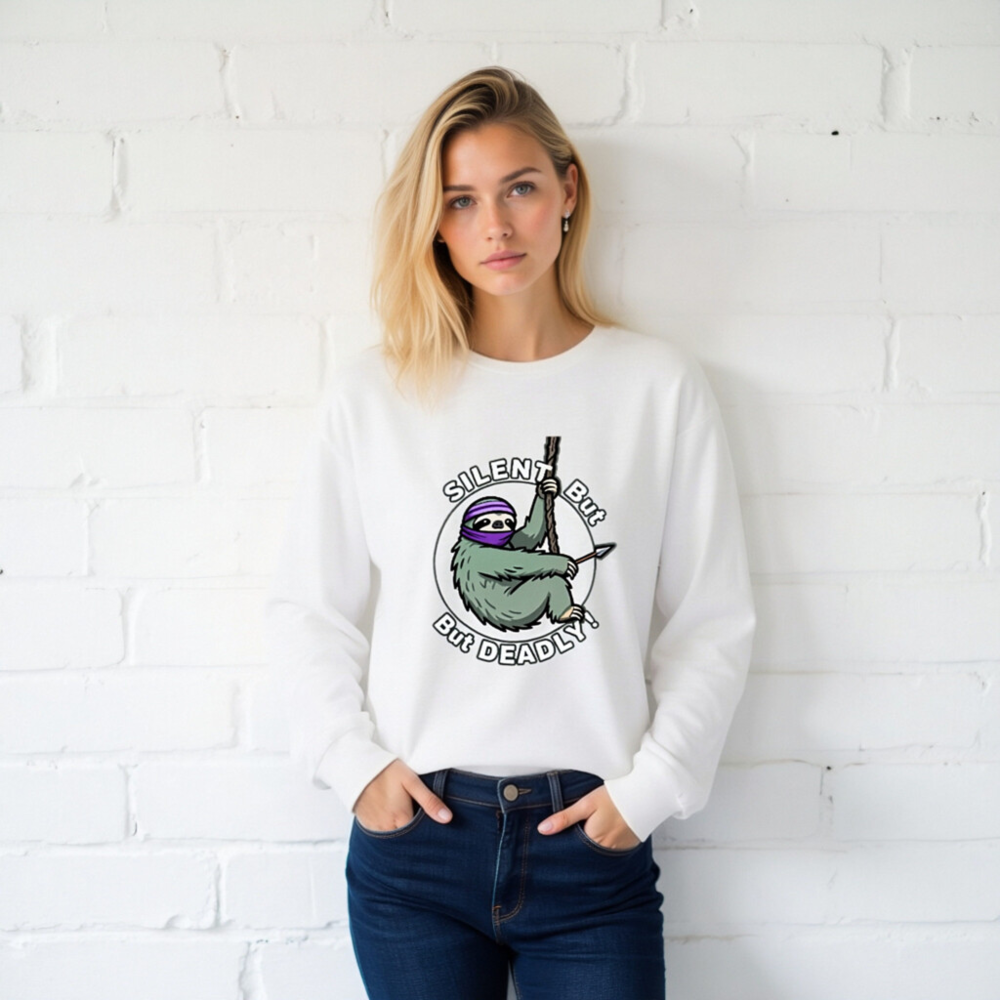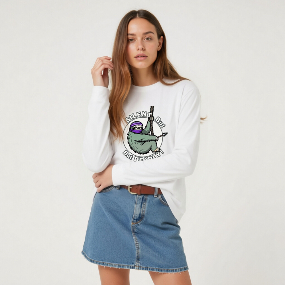 This unisex long sleeve tee features a playful sloth ninja graphic—purple headband, rope grip, and dart in hand—encircled by the bold phrase ‘SILENT But But DEADLY!’. Designed for comfort and humor, it’s perfect for fans of quirky animal art and pop-culture puns. Lightweight cotton blend, classic fit, great for casual wear or as a fun gift.