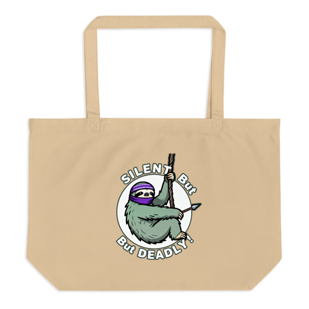 This large organic tote bag features a playful ‘Silent But Deadly’ sloth ninja design—soft, durable, and sustainably made. Crafted from certified organic cotton, it’s perfect for shopping, travel, or everyday use. Lightweight, spacious, and machine-washable. Supports eco-conscious living with zero synthetic additives. Ideal gift for nature lovers & humor fans.