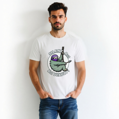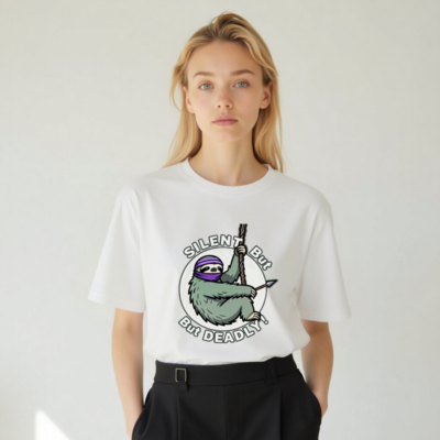 This unisex organic cotton t-shirt features a playful sloth ninja design with the bold phrase ‘SILENT But DEADLY!’—perfect for fans of humor, nature, and quirky animal art. Made from certified organic cotton for comfort and sustainability. Ideal for everyday wear or as a fun gift. Lightweight, breathable, and eco-conscious.
