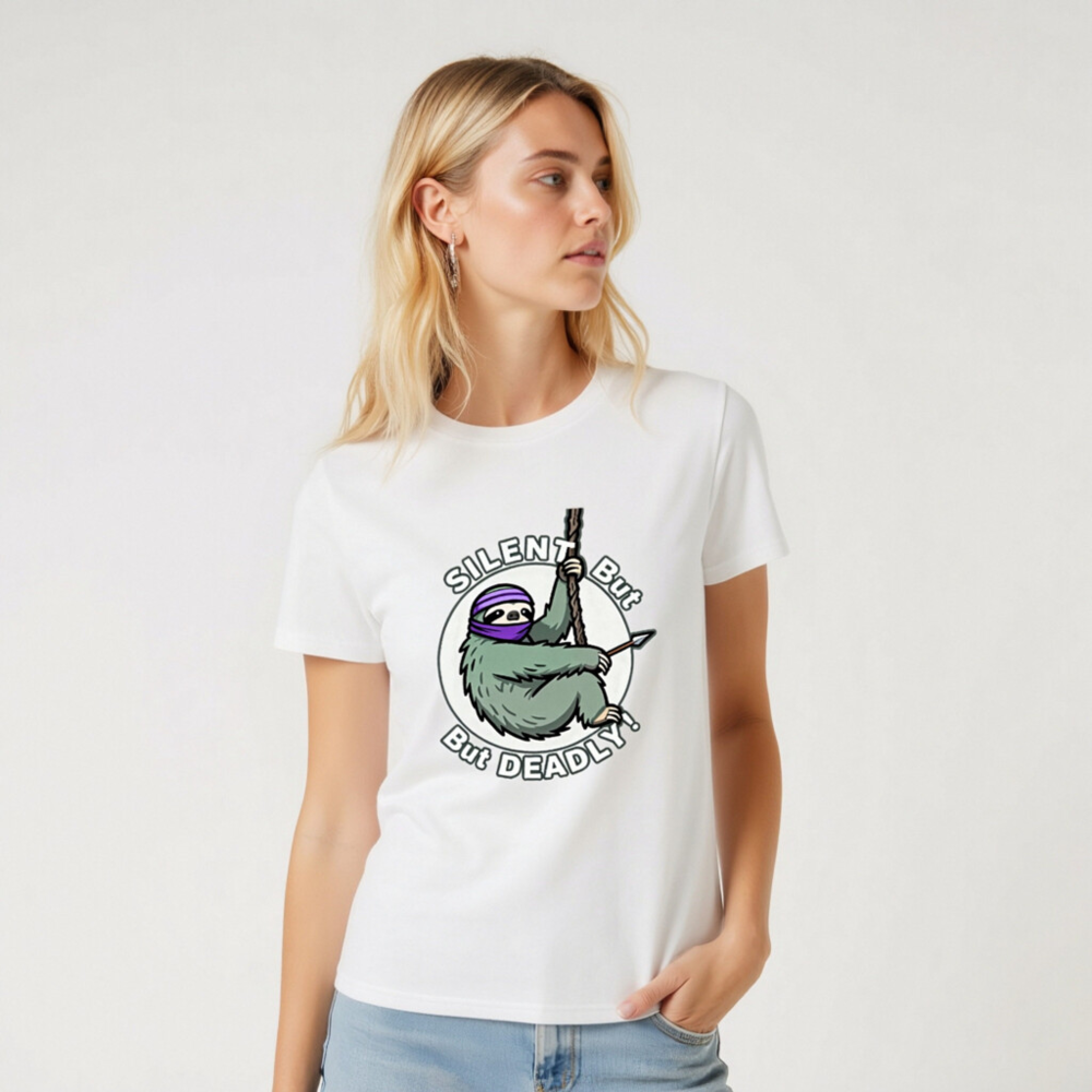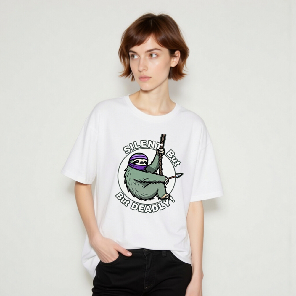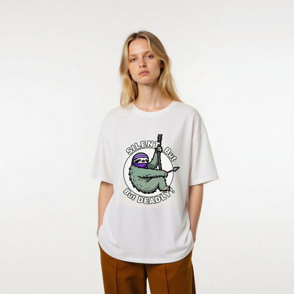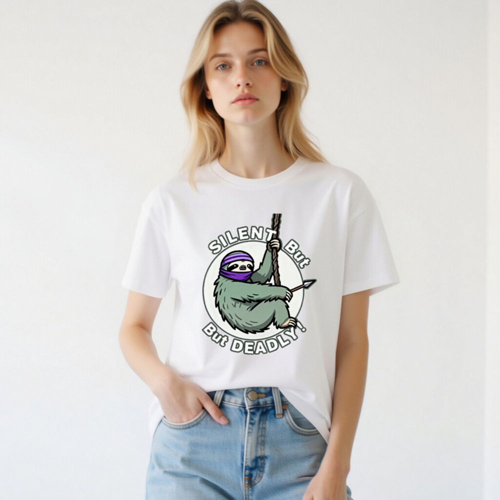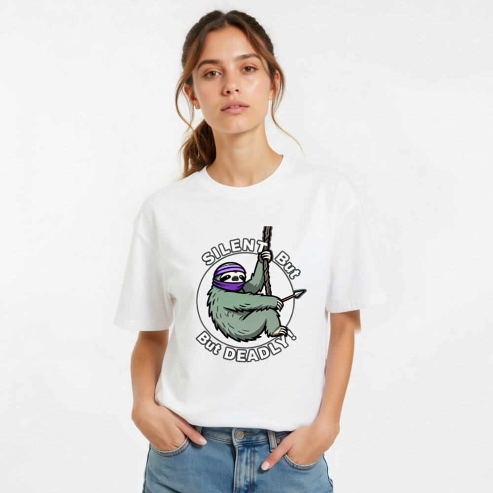 This unisex organic cotton t-shirt features a playful sloth ninja design with the bold phrase ‘SILENT But DEADLY!’—perfect for fans of humor, nature, and quirky animal art. Made from certified organic cotton for comfort and sustainability. Ideal for everyday wear or as a fun gift. Lightweight, breathable, and eco-conscious.