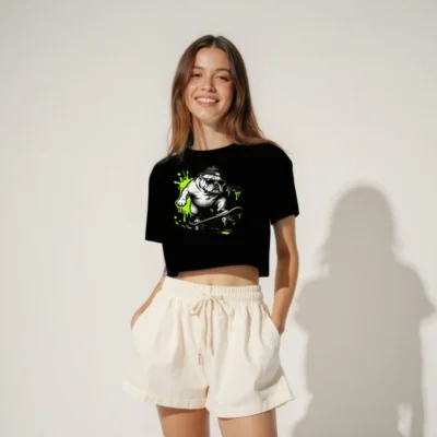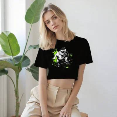 Cool women’s crop top featuring a bold, black-and-white bulldog skateboarding in sunglasses and beanie, accented with vibrant neon green splatter. Designed for streetwear lovers—fit is relaxed, fabric is soft cotton blend. Perfect for casual outings or skate culture fans. Style code: BT-CT-W-01.